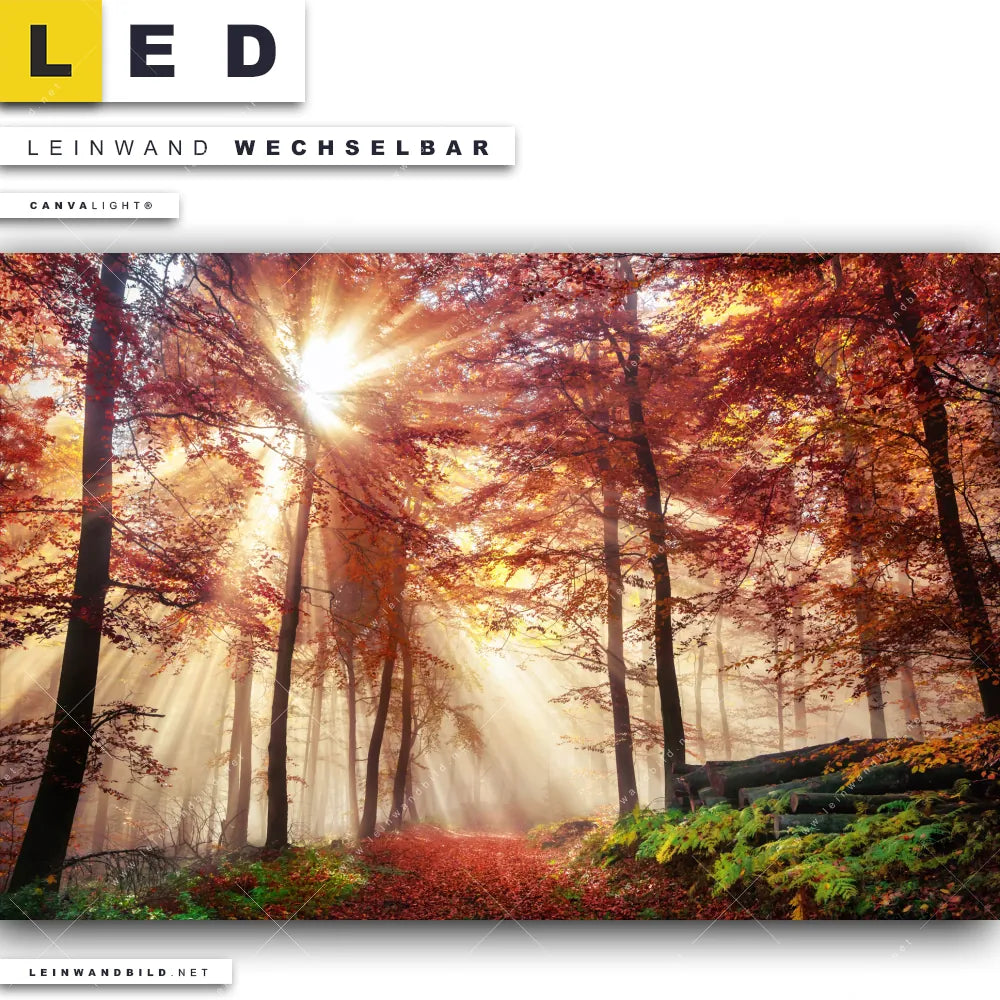 Begriffe wie Wald, Landschaft, Baum, Bäume, Natur, Sonne, Sonnenstrahlen, Licht, Sonnenlicht, Laubwald, Nebel, Dunst, Herbst, Laub haben Dich auf der Suche nach Deinem neuen LED Wandbild mit beleuchteter Leinwand inspiriert? Dann sollte das LED Bild Sonnenstrahlen durch herbstliche Baumkronen mit austauschbarer Textil-Fotoleinwand den Weg zu Dir finden.