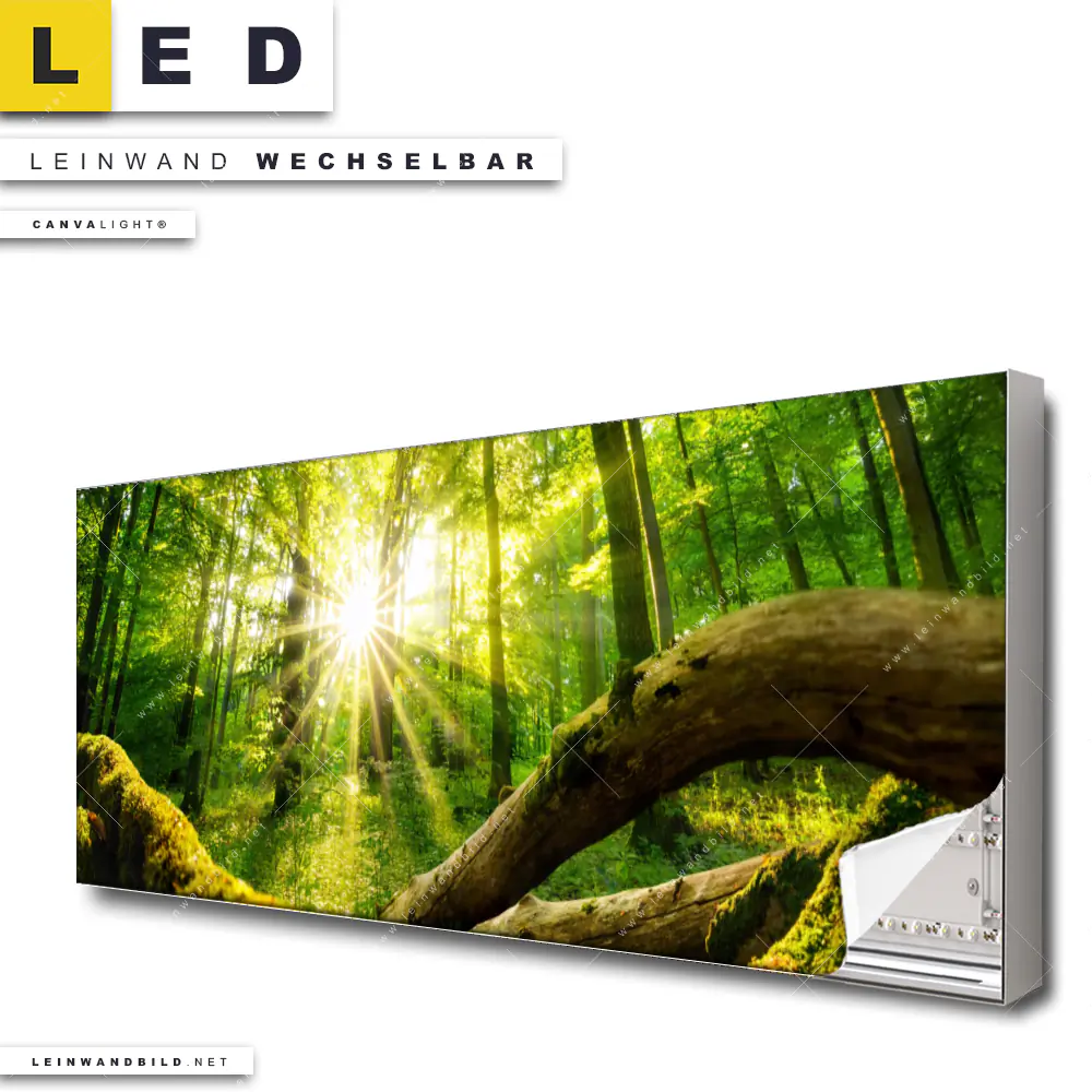 LED Leinwandbild Canvalight® TEX | Sonnenstrahlen im dichten Wald | Panorama