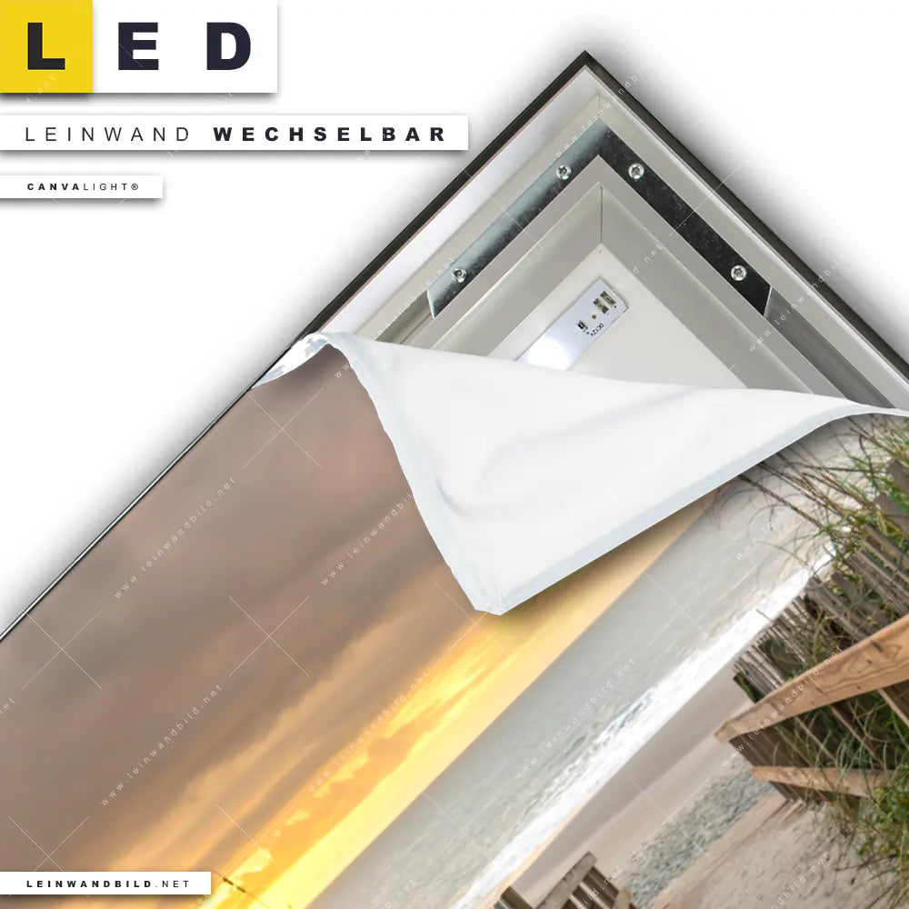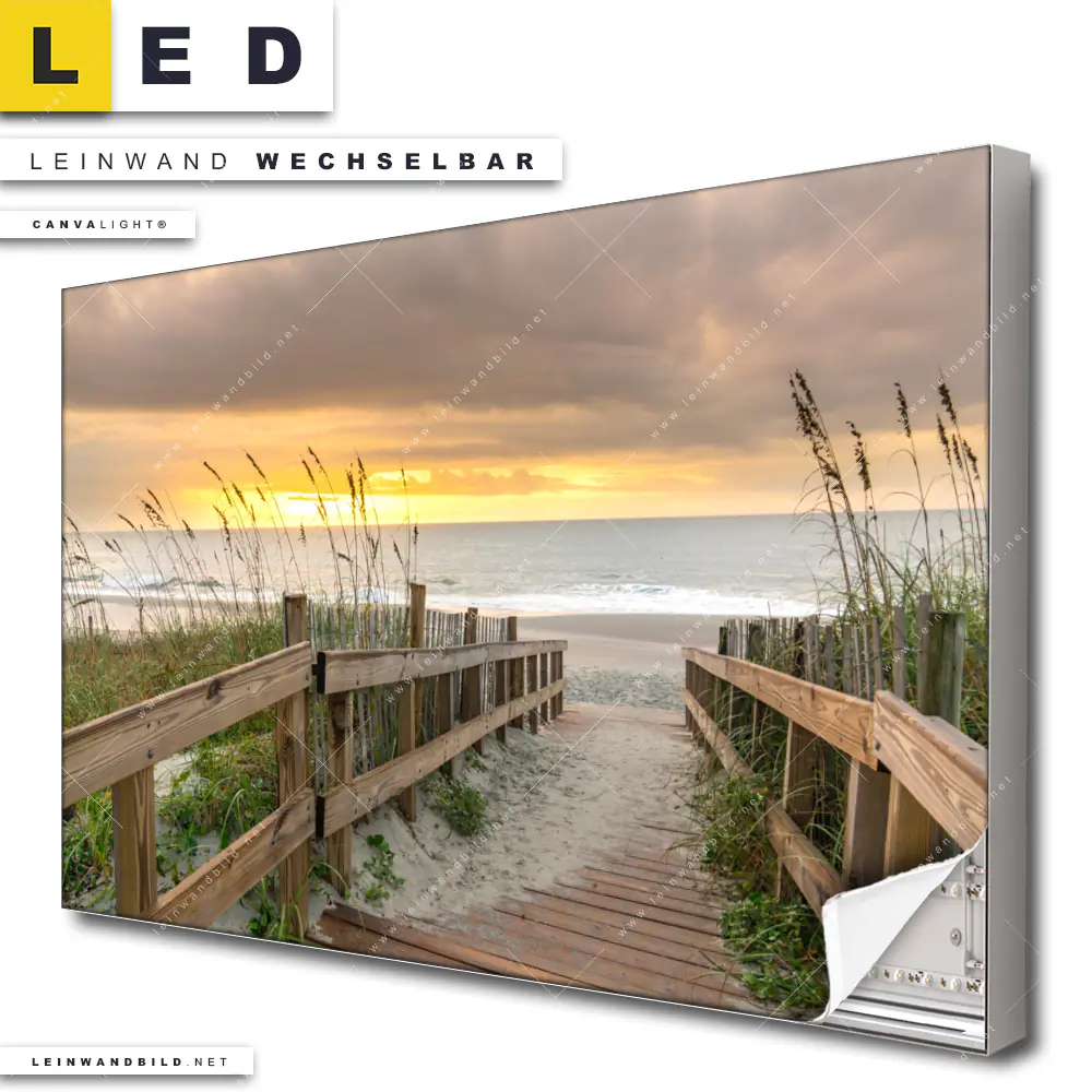 Du konfigurierst Dein individuelles LED Leinwandbild Canvalight® TEX | Sonnenuntergang am Strandweg | Querformat und wir produzieren es NEU für Dich. Unsere Strand - Meer, Landschaften LED Bilder mit wechselbarer Textil-Leinwand sind KEINE Lagerware. Du bist Dir unsicher, welches Motiv oder Format das richtige für dein individuelles Canvalight® Leuchtbild ist, dann helfen wir dir gerne weiter und beraten dich!
