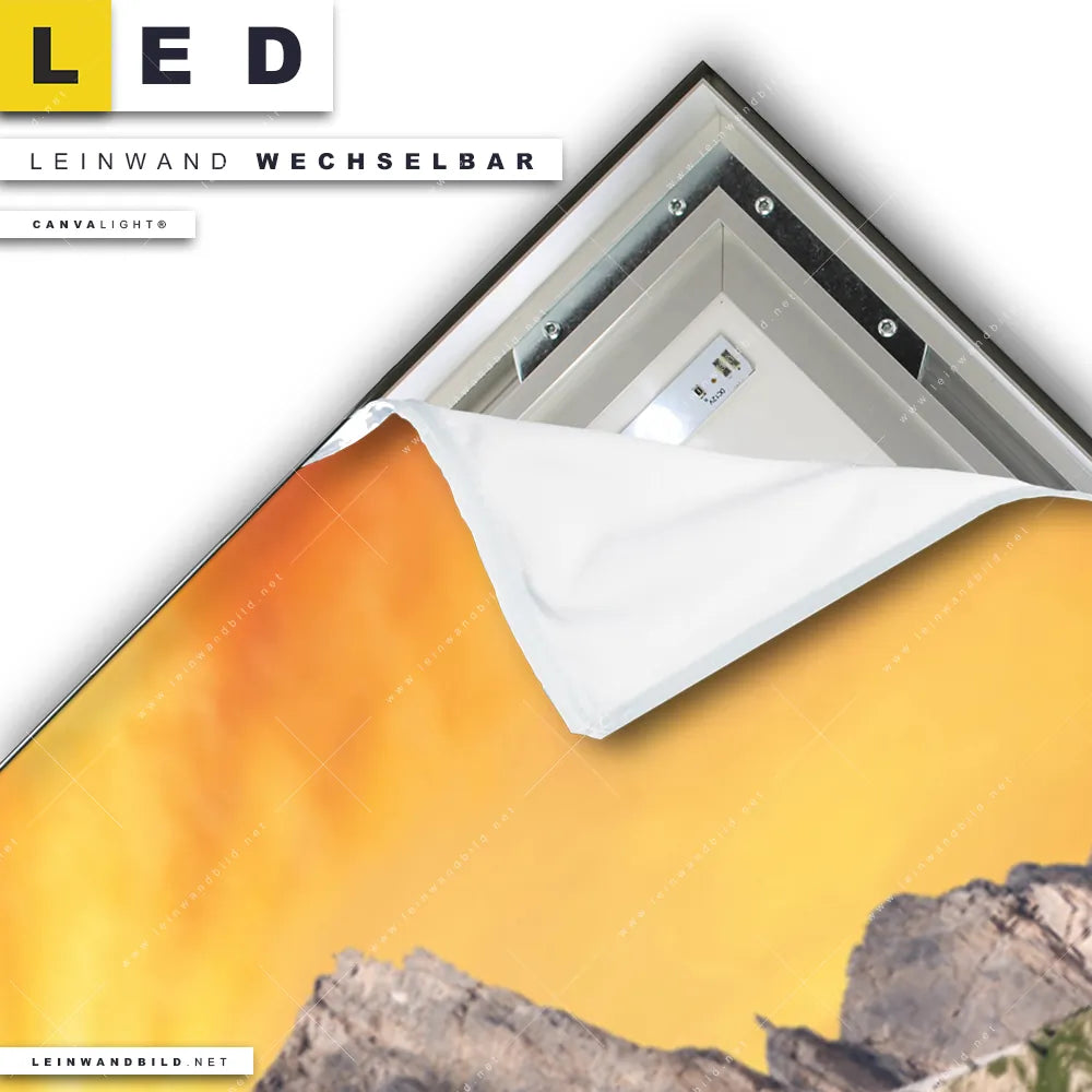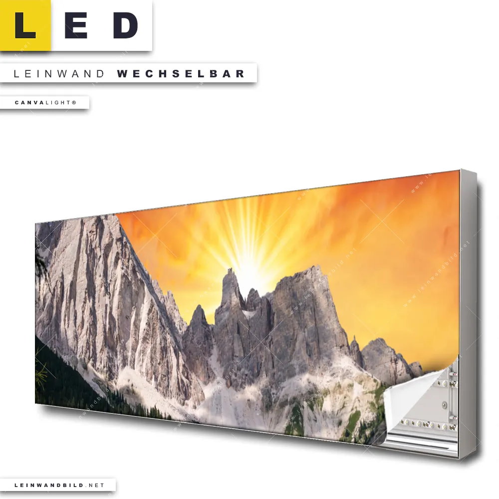 Du konfigurierst Dein individuelles LED Leinwandbild Canvalight® TEX | Sonnenuntergang in den Bergen | Panorama und wir produzieren es NEU für Dich. Unsere Landschaften LED Bilder mit wechselbarer Textil-Leinwand sind KEINE Lagerware. Du bist Dir unsicher, welches Motiv oder Format das richtige für dein individuelles Canvalight® Leuchtbild ist, dann helfen wir dir gerne weiter und beraten dich!