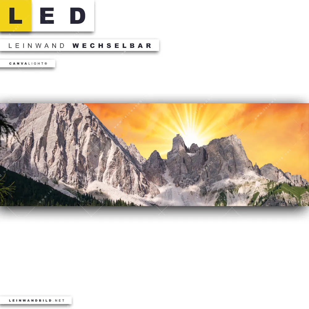 Du bist auf der Suche nach einem Landschaften LED Leinwandbild im Panorama-Format? Begriffe wie Natur, Stille, Berge, Sonnenuntergang, Sonnenaufgang, Sonne, Gebirge, Bäume haben Dich auf der Suche nach Deinem neuen XXL LED Wandbild mit wechselbarer Leinwand inspiriert? Farben wie Orange, Pink, Lila dürfen auf Deinem neuen extra breiten Leinwand-LED-Bild nicht fehlen und Leuchtbilder im Natürlich - Realistisch, Mixed Media Stil passen perfekt zu Deinem Einrichtungsstil?
