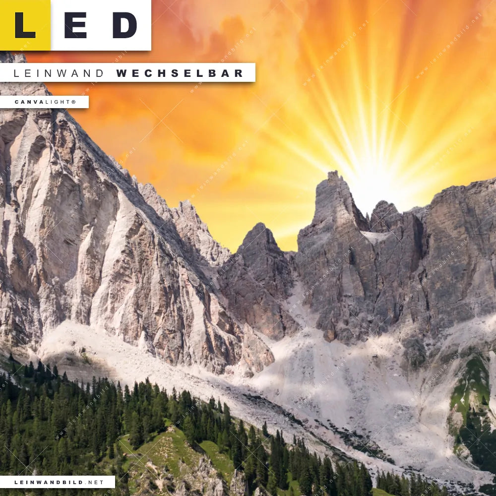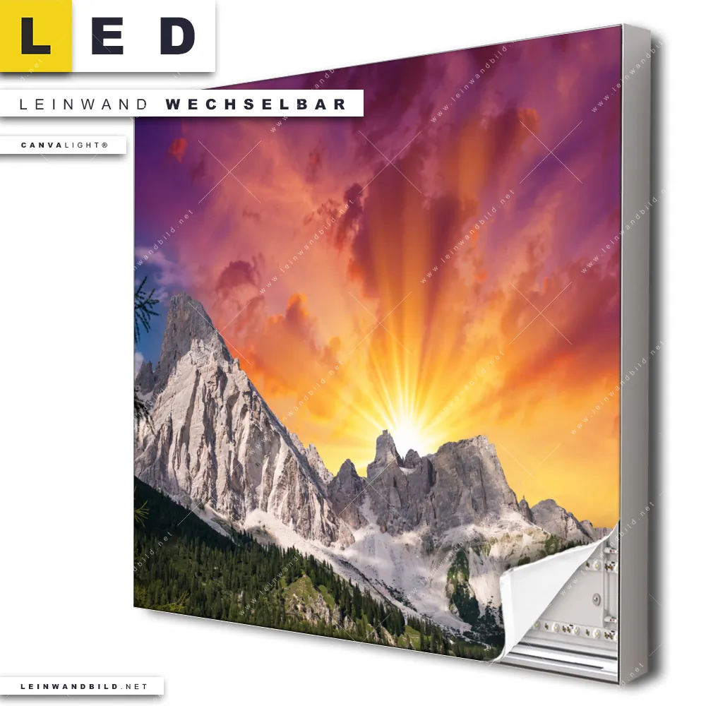 Du konfigurierst Dein individuelles LED Leinwandbild Canvalight® TEX | Sonnenuntergang in den Bergen | Quadrat und wir produzieren es NEU für Dich. Unsere Landschaften LED Bilder mit wechselbarer Textil-Leinwand sind KEINE Lagerware. Du bist Dir unsicher, welches Motiv oder Format das richtige für dein individuelles Canvalight® Leuchtbild ist, dann helfen wir dir gerne weiter und beraten dich!