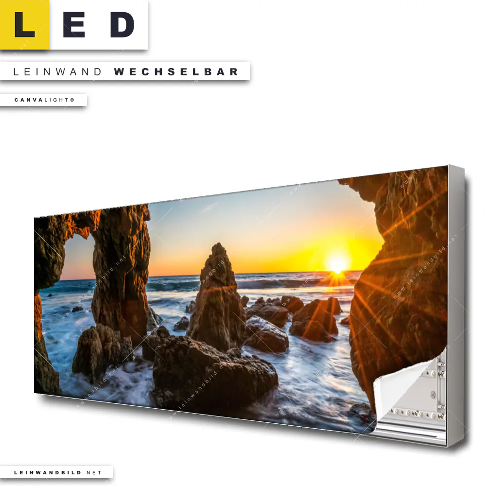 LED Leinwandbild Canvalight® TEX | Sonnenuntergang in Meeresgrotte | Panorama