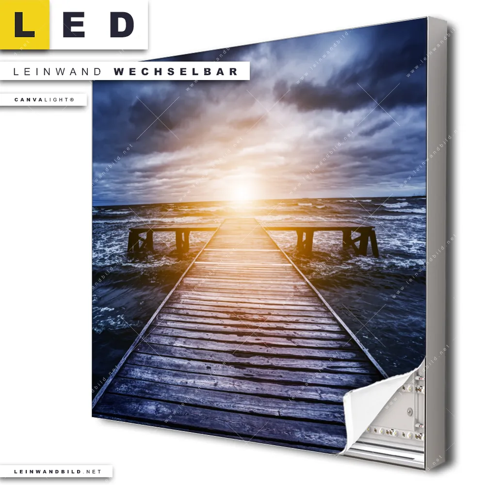 Dann sollte das LED Leinwandbild Canvalight® TEX | Sonnenuntergang & Meer | Quadrat den Weg zu Dir finden. Das stufenlos dimmbare Leinwandbild Holzsteg im brausenden Meer im steckerfertigen Leuchtrahmen mit Fernbedienung und optionaler Farbtemperatursteuerung fügt sich als Eye-Catcher harmonisch in jedes Büro - Kanzlei, Wohnzimmer - Schlafzimmer Raumkonzept ein.