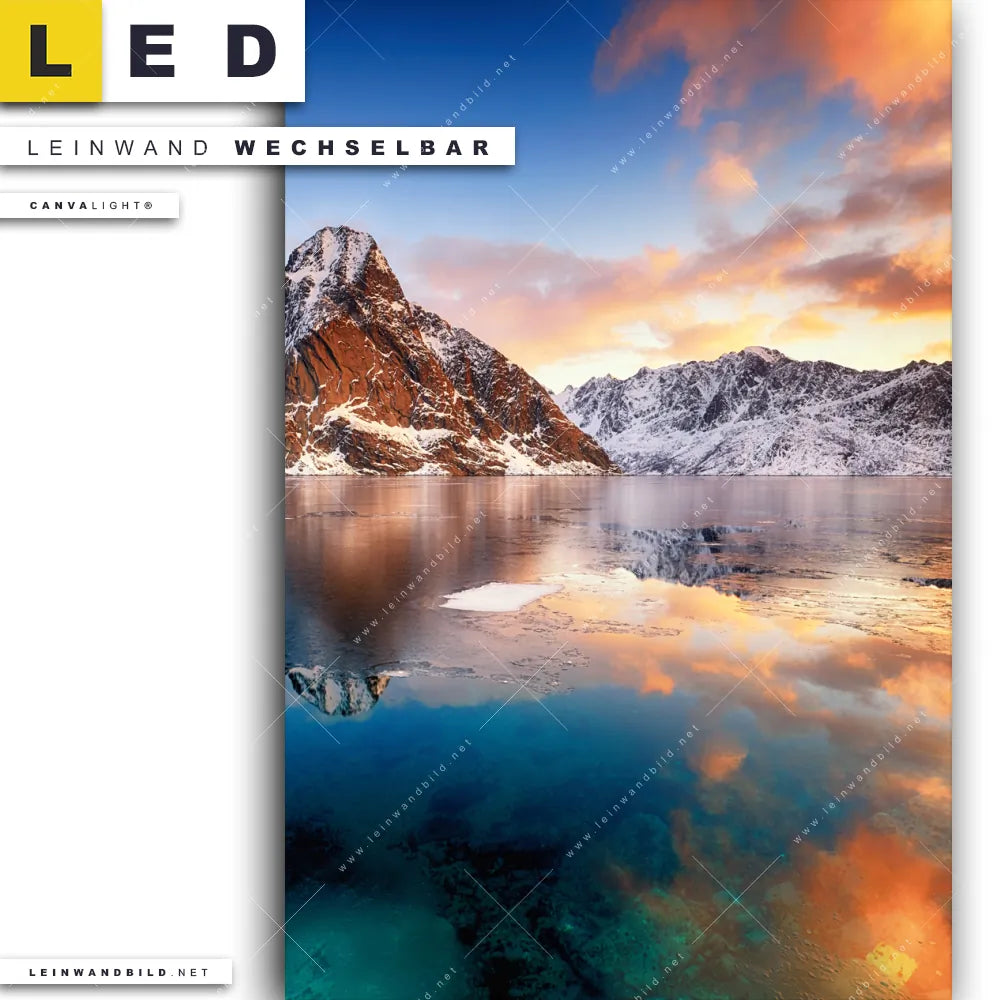 Dann sollte das LED Leinwandbild Canvalight® TEX | Sonnenuntergang Norwegen | Hochformat den Weg zu Dir finden. Das stufenlos dimmbare Leinwandbild gefrorener See an den Bergen im steckerfertigen Leuchtrahmen mit Fernbedienung und optionaler Farbtemperatursteuerung fügt sich als Eye-Catcher harmonisch in jedes Arzt - Praxis, Büro - Kanzlei, Wohnzimmer - Schlafzimmer Raumkonzept ein.
