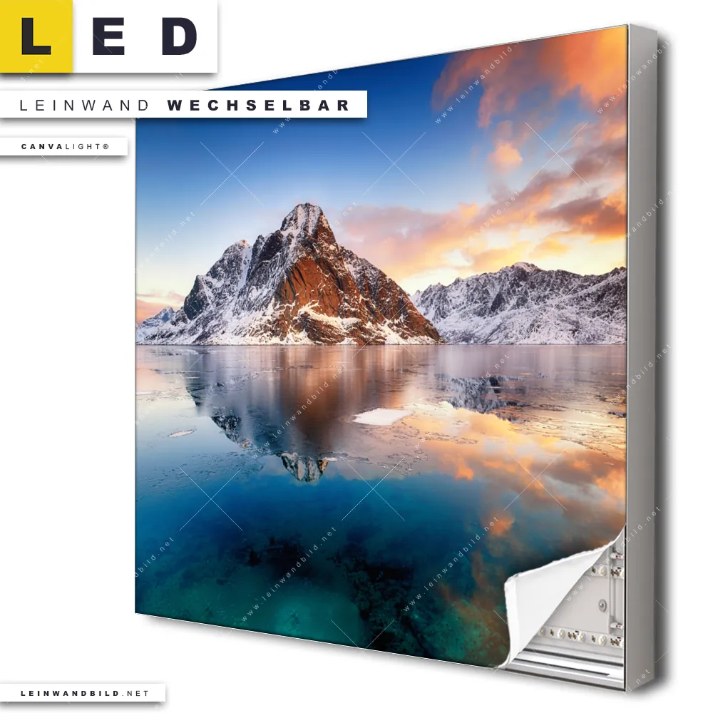 Dann sollte das LED Leinwandbild Canvalight® TEX | Sonnenuntergang Norwegen | Quadrat den Weg zu Dir finden. Das stufenlos dimmbare Leinwandbild gefrorener See an den Bergen im steckerfertigen Leuchtrahmen mit Fernbedienung und optionaler Farbtemperatursteuerung fügt sich als Eye-Catcher harmonisch in jedes Arzt - Praxis, Büro - Kanzlei, Wohnzimmer - Schlafzimmer Raumkonzept ein.
