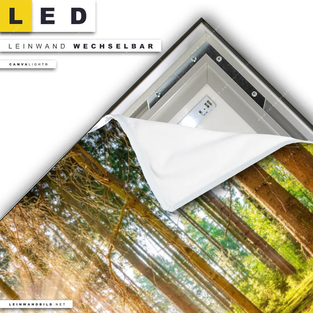 Du konfigurierst Dein individuelles LED Leinwandbild Canvalight® TEX | Sonniger Wald | Hochformat und wir produzieren es NEU für Dich. Unsere Landschaften, Wald - Bäume LED Bilder mit wechselbarer Textil-Leinwand sind KEINE Lagerware. Du bist Dir unsicher, welches Motiv oder Format das richtige für dein individuelles Canvalight® Leuchtbild ist, dann helfen wir dir gerne weiter und beraten dich!