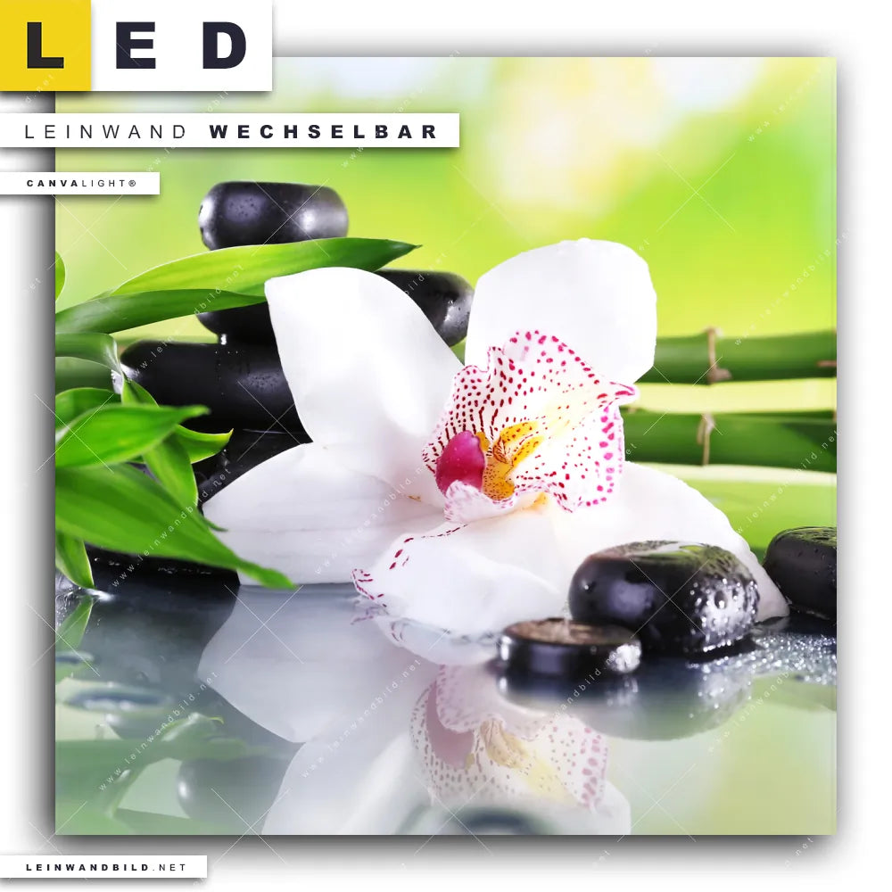 Dann sollte das LED Leinwandbild Canvalight® TEX | Spa Wellness Steine | Quadrat den Weg zu Dir finden. Das stufenlos dimmbare Leinwandbild Orchideenruhe im steckerfertigen Leuchtrahmen mit Fernbedienung und optionaler Farbtemperatursteuerung fügt sich als Eye-Catcher harmonisch in jedes Arzt - Praxis, Büro - Kanzlei, Flur - Eingangsbereich, Wohnzimmer - Schlafzimmer, Friseur - Beauty Raumkonzept ein.