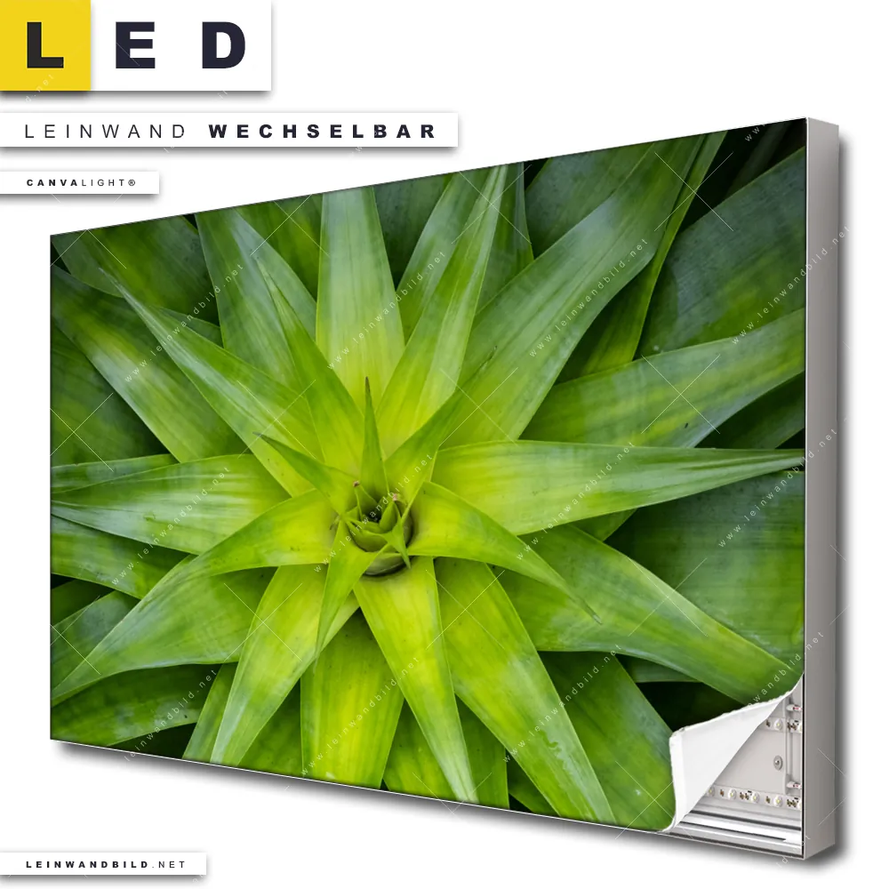 Du konfigurierst Dein individuelles LED Leinwandbild Canvalight® TEX | Spitze Agavenblätter | Querformat und wir produzieren es NEU für Dich. Unsere Blumen - Botanik LED Bilder mit wechselbarer Textil-Leinwand sind KEINE Lagerware. Du bist Dir unsicher, welches Motiv oder Format das richtige für dein individuelles Canvalight® Leuchtbild ist, dann helfen wir dir gerne weiter und beraten dich!