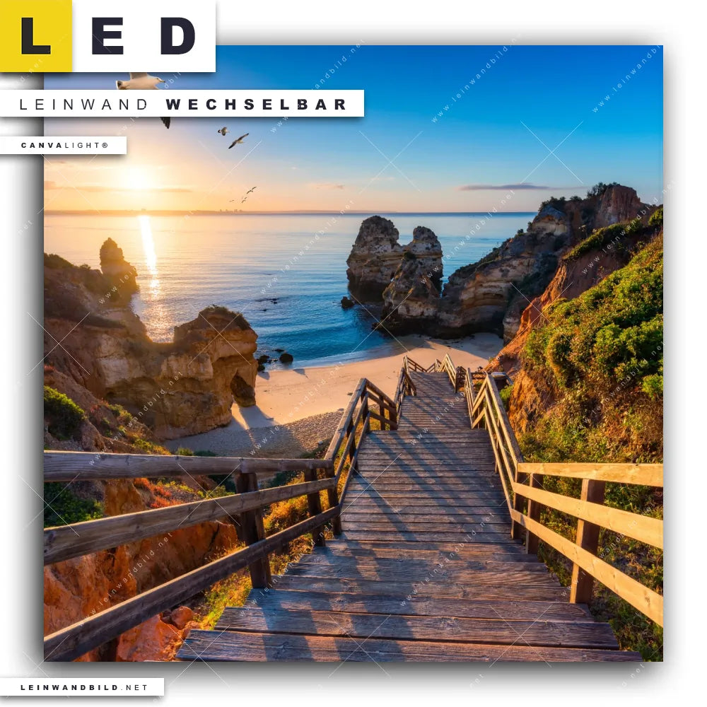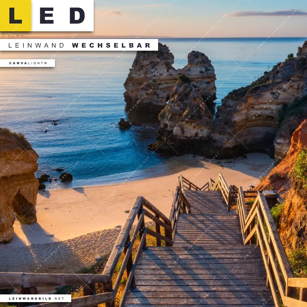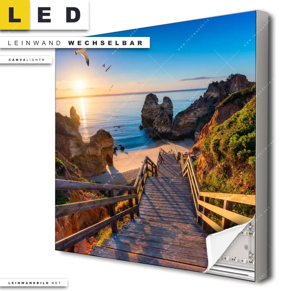 Dann sollte das LED Leinwandbild Canvalight® TEX | Steg zum Meer | Quadrat den Weg zu Dir finden. Das stufenlos dimmbare Leinwandbild Hölzerne Treppe zum Meer im steckerfertigen Leuchtrahmen mit Fernbedienung und optionaler Farbtemperatursteuerung fügt sich als Eye-Catcher harmonisch in jedes Büro - Kanzlei, Wohnzimmer - Schlafzimmer, Bar - Gastronomie Raumkonzept ein.