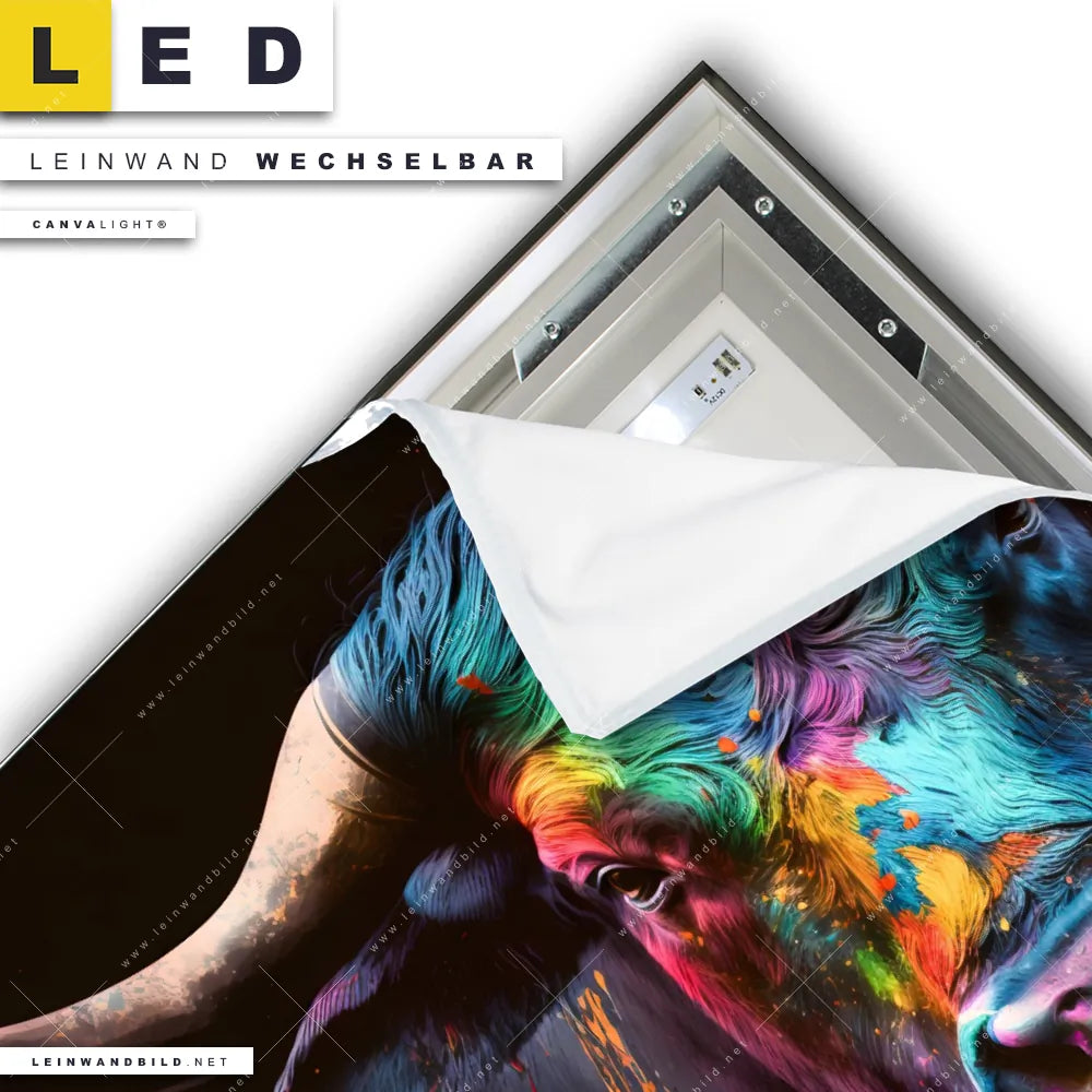 LED Leinwandbild Canvalight® TEX | Stier mit bunten Farben | Quadrat