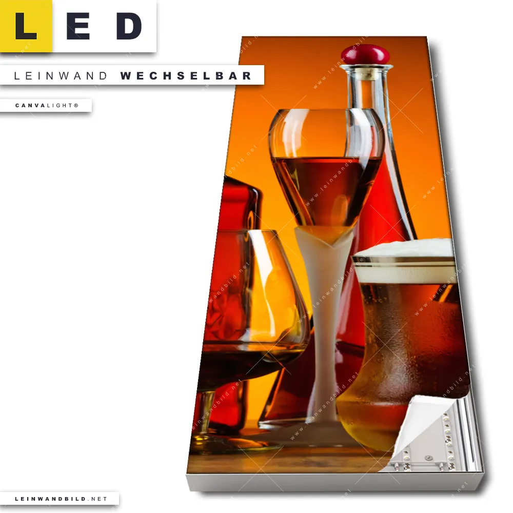 Du bist auf der Suche nach einem Essen - Trinken LED Leinwandbild im Schmalen Format? Begriffe wie Flaschen, Glas, Getränke, Wein, Whiskey, Bier, Cognac, Likör, Alkohol haben Dich auf der Suche nach Deinem neuen XXL LED Wandbild mit wechselbarer Leinwand inspiriert? Farben wie Gold, Orange, Rot dürfen auf Deinem neuen Leinwand-LED-Bild im Panorama-Hochformat nicht fehlen und Leuchtbilder im Natürlich - Realistisch Stil passen perfekt zu Deinem Einrichtungsstil?
