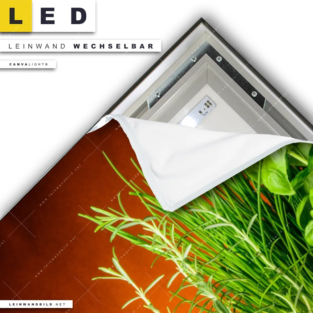 Du konfigurierst Dein individuelles LED Leinwandbild Canvalight® TEX | Stillleben mit mediterranen Kräutern | Hochformat und wir produzieren es NEU für Dich. Unsere Essen - Trinken LED Bilder mit wechselbarer Textil-Leinwand sind KEINE Lagerware. Du bist Dir unsicher, welches Motiv oder Format das richtige für dein individuelles Canvalight® Leuchtbild ist, dann helfen wir dir gerne weiter und beraten dich!