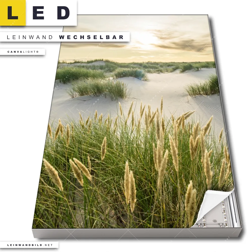 Du bist auf der Suche nach einem Landschaften, Strand - Meer LED Leinwandbild im Hochformat? Begriffe wie Deutschland, Frühling, Sommer, Sonnenuntergang - Sonnenaufgang, Urlaub - Reisen, Ostsee - Nordsee, Dünen, Gräser haben Dich auf der Suche nach Deinem neuen XXL LED Wandbild mit wechselbarer Leinwand inspiriert? Farben wie Beige, Grün dürfen auf Deinem neuen Leinwand-LED-Bild nicht fehlen und Leuchtbilder im Retro - Vintage Stil passen perfekt zu Deinem Einrichtungsstil?