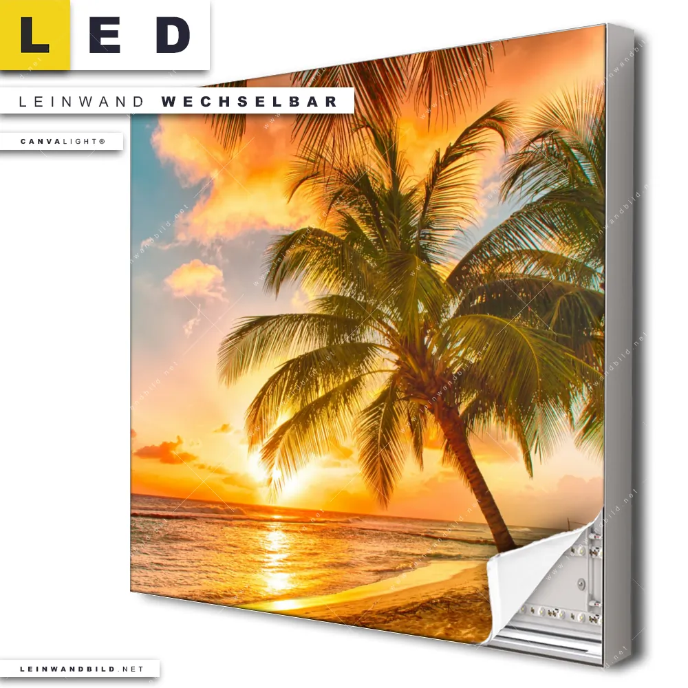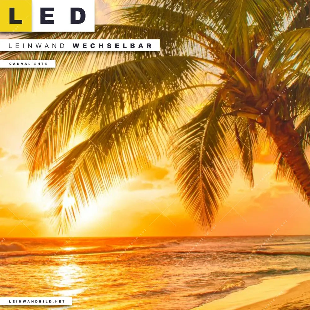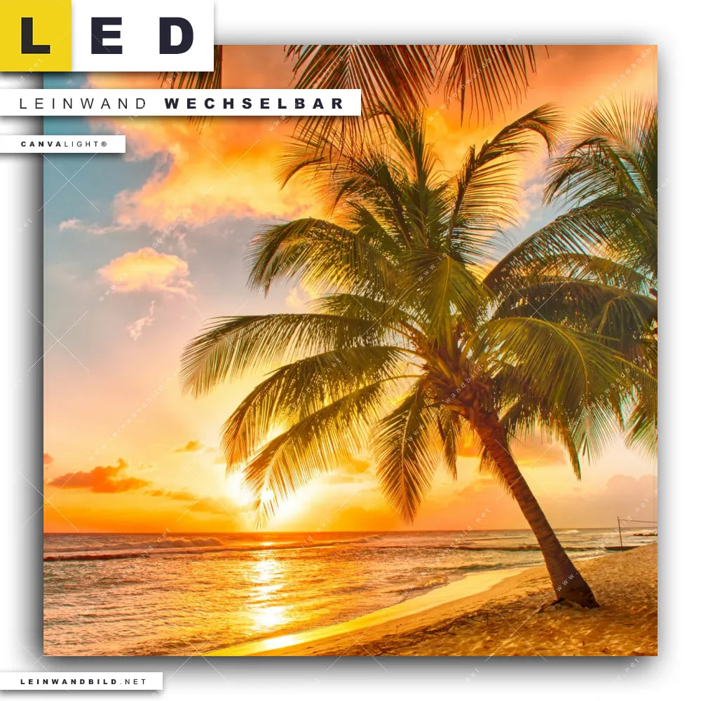 Du bist auf der Suche nach einem Landschaften, Strand - Meer LED Leinwandbild im Quadratischen Format? Begriffe wie Horizont, Palmen, Insel, Sommer, Südsee - Karibik, Urlaub - Reisen, Sonnenuntergang - Sonnenaufgang haben Dich auf der Suche nach Deinem neuen XXL LED Wandbild mit wechselbarer Leinwand inspiriert? Farben wie Blau, Orange, Beige dürfen auf Deinem neuen Leinwand-LED-Bild nicht fehlen und Leuchtbilder im Retro - Vintage Stil passen perfekt zu Deinem Einrichtungsstil?