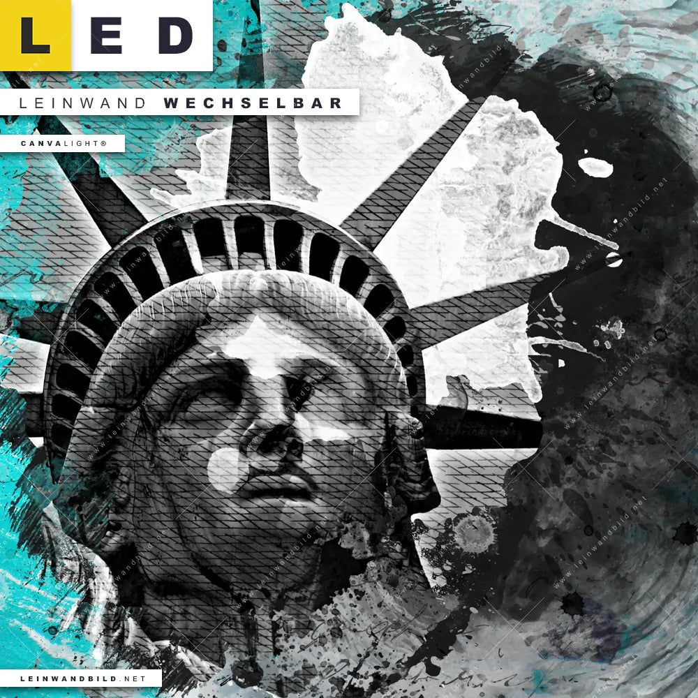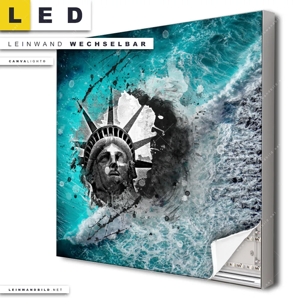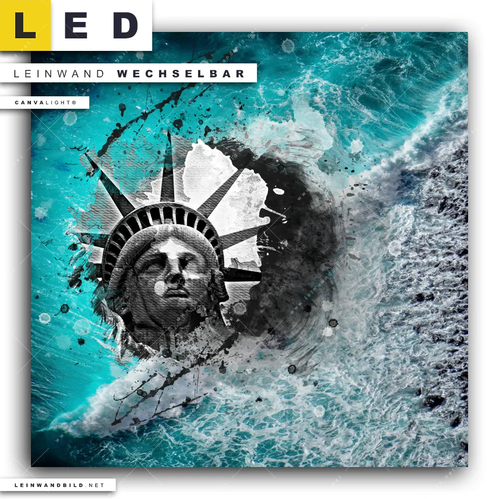 Du bist auf der Suche nach einem Städte - Skylines, Strand - Meer LED Leinwandbild im Quadratischen Format? Begriffe wie Grunge, Streetart, modern, Freiheitsstatue, Statue of Liberty, Amerika, USA, Meer, Ozean, Wellen haben Dich auf der Suche nach Deinem neuen XXL LED Wandbild mit wechselbarer Leinwand inspiriert? Farben wie Türkis, Grau , Schwarz dürfen auf Deinem neuen Leinwand-LED-Bild nicht fehlen und Leuchtbilder im Abstrakt, Grunge, Mixed Media, Modern Art Stil passen perfekt zu Deinem Einrichtungsstil?
