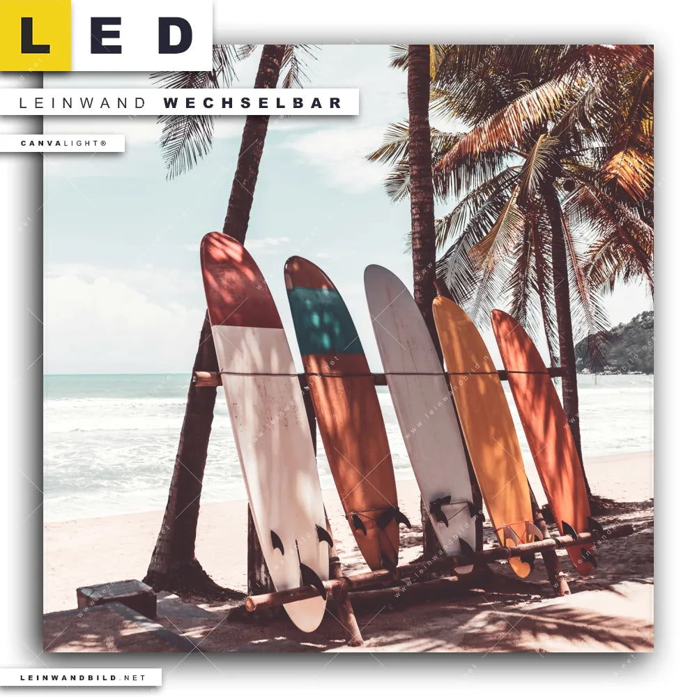 LED Leinwandbild Canvalight® TEX | Surfbretter und Palmen | Quadrat