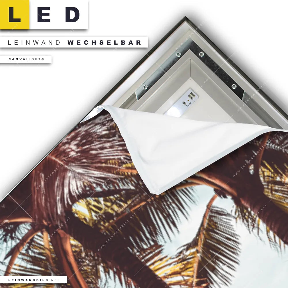 Du konfigurierst Dein individuelles LED Leinwandbild Canvalight® TEX | Surfbretter und Palmen | Schmal und wir produzieren es NEU für Dich. Unsere Strand - Meer LED Bilder mit wechselbarer Textil-Leinwand sind KEINE Lagerware. Du bist Dir unsicher, welches Motiv oder Format das richtige für dein individuelles Canvalight® Leuchtbild ist, dann helfen wir dir gerne weiter und beraten dich!
