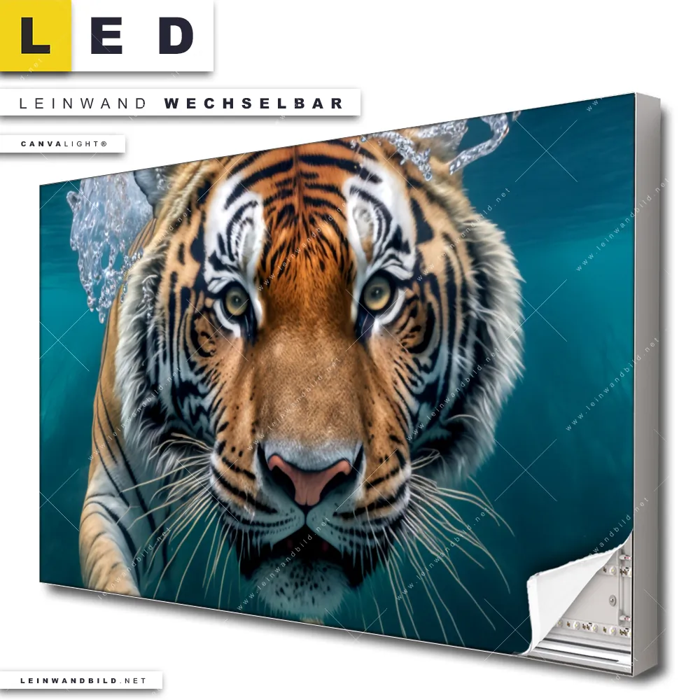 Du konfigurierst Dein individuelles LED Leinwandbild Canvalight® TEX | Tauchender Tiger | Querformat und wir produzieren es NEU für Dich. Unsere Tierwelt LED Bilder mit wechselbarer Textil-Leinwand sind KEINE Lagerware. Du bist Dir unsicher, welches Motiv oder Format das richtige für dein individuelles Canvalight® Leuchtbild ist, dann helfen wir dir gerne weiter und beraten dich!