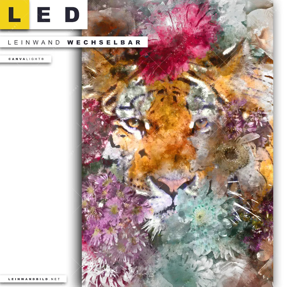 Du bist auf der Suche nach einem Tierwelt, Blumen - Botanik LED Leinwandbild im Hochformat? Begriffe wie Tiere & Blumen, Tier, Blumen, Kunst, Aquarell, Tiger, Raubkatze, Blüten haben Dich auf der Suche nach Deinem neuen XXL LED Wandbild mit wechselbarer Leinwand inspiriert? Farben wie Pink, Beige, Rot, Braun dürfen auf Deinem neuen Leinwand-LED-Bild nicht fehlen und Leuchtbilder im Floral, Modern Art, Surreal - Fantasy Stil passen perfekt zu Deinem Einrichtungsstil?