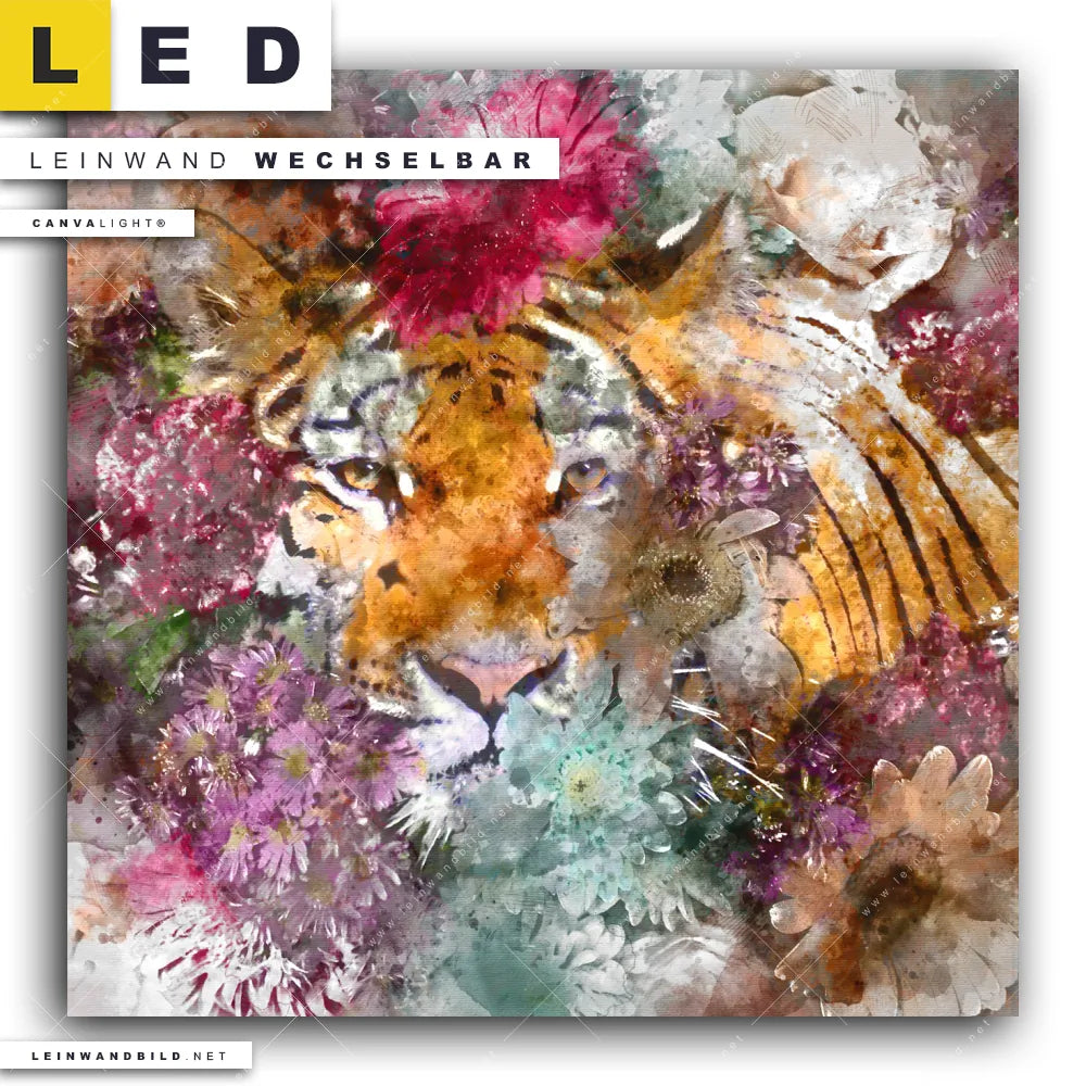 Du bist auf der Suche nach einem Tierwelt, Blumen - Botanik LED Leinwandbild im Quadratischen Format? Begriffe wie Tiere & Blumen, Tier, Blumen, Kunst, Aquarell, Tiger, Raubkatze, Blüten haben Dich auf der Suche nach Deinem neuen XXL LED Wandbild mit wechselbarer Leinwand inspiriert? Farben wie Pink, Beige, Rot, Braun dürfen auf Deinem neuen Leinwand-LED-Bild nicht fehlen und Leuchtbilder im Floral, Modern Art, Surreal - Fantasy Stil passen perfekt zu Deinem Einrichtungsstil?