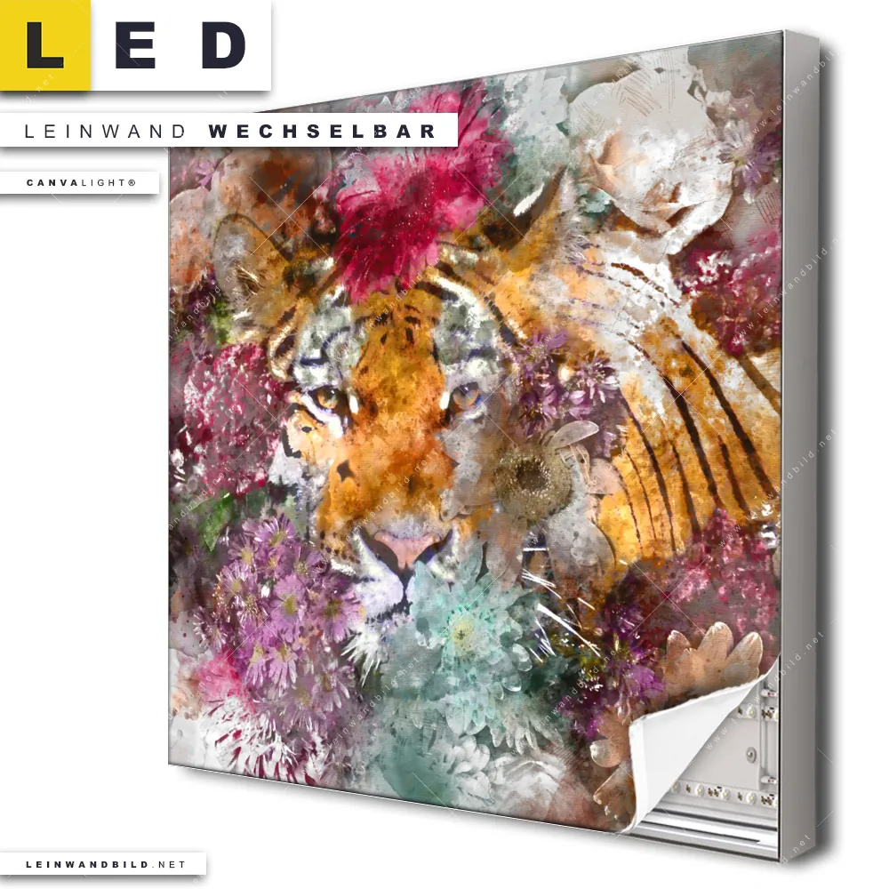 Dann sollte das LED Leinwandbild Canvalight® TEX | Tiger & Blumen | Quadrat den Weg zu Dir finden. Das stufenlos dimmbare Leinwandbild Aquarell-Tiger im steckerfertigen Leuchtrahmen mit Fernbedienung und optionaler Farbtemperatursteuerung fügt sich als Eye-Catcher harmonisch in jedes Wohnzimmer - Schlafzimmer, Arzt - Praxis, Badezimmer, Bar - Gastronomie, Büro - Kanzlei, Flur - Eingangsbereich Raumkonzept ein.