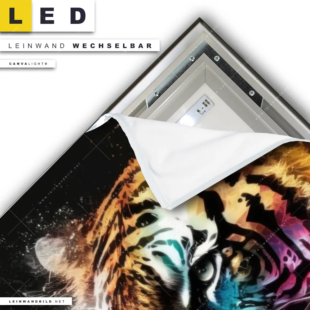 Du konfigurierst Dein individuelles LED Leinwandbild Canvalight® TEX | Tiger im Farbrausch | Hochformat und wir produzieren es NEU für Dich. Unsere Tierwelt LED Bilder mit wechselbarer Textil-Leinwand sind KEINE Lagerware. Du bist Dir unsicher, welches Motiv oder Format das richtige für dein individuelles Canvalight® Leuchtbild ist, dann helfen wir dir gerne weiter und beraten dich!