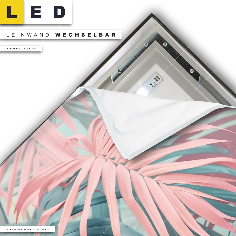 Du konfigurierst Dein individuelles LED Leinwandbild Canvalight® TEX | Tropische Blätter in Pastellfarben | Querformat und wir produzieren es NEU für Dich. Unsere Blumen - Botanik, Muster - Texturen LED Bilder mit wechselbarer Textil-Leinwand sind KEINE Lagerware. Du bist Dir unsicher, welches Motiv oder Format das richtige für dein individuelles Canvalight® Leuchtbild ist, dann helfen wir dir gerne weiter und beraten dich!