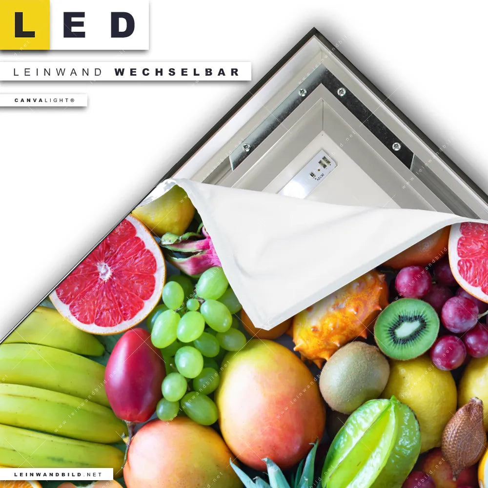 Du konfigurierst Dein individuelles LED Leinwandbild Canvalight® TEX | Tropische Früchte | Quadrat und wir produzieren es NEU für Dich. Unsere Essen - Trinken LED Bilder mit wechselbarer Textil-Leinwand sind KEINE Lagerware. Du bist Dir unsicher, welches Motiv oder Format das richtige für dein individuelles Canvalight® Leuchtbild ist, dann helfen wir dir gerne weiter und beraten dich!