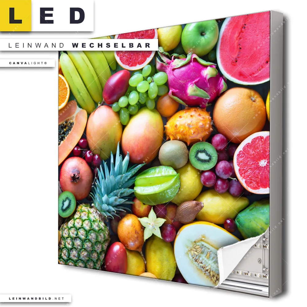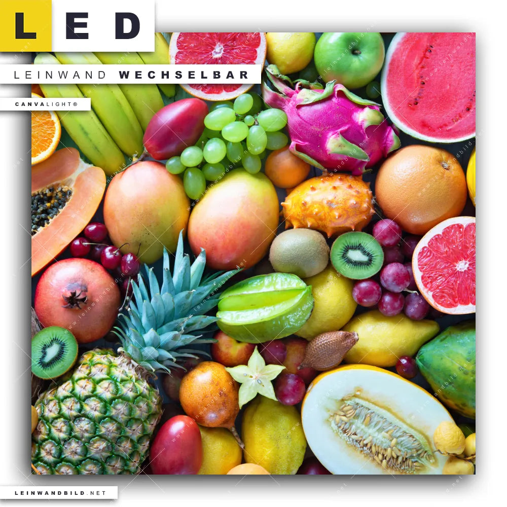 Du bist auf der Suche nach einem Essen - Trinken LED Leinwandbild im Quadratischen Format? Begriffe wie Obst, Zitrusfrüchte, Früchte, Kiwi, frisch, Banane, Ananas, Kokosnuss, Tropfen, Orange, Mango haben Dich auf der Suche nach Deinem neuen XXL LED Wandbild mit wechselbarer Leinwand inspiriert? Farben wie Bunt dürfen auf Deinem neuen Leinwand-LED-Bild nicht fehlen und Leuchtbilder im Natürlich - Realistisch Stil passen perfekt zu Deinem Einrichtungsstil?