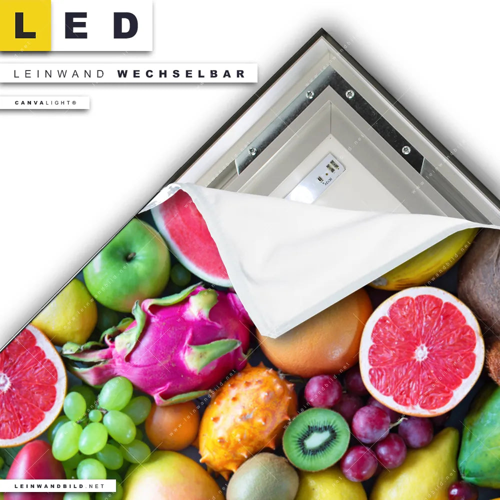 Du konfigurierst Dein individuelles LED Leinwandbild Canvalight® TEX | Tropische Früchte | Querformat und wir produzieren es NEU für Dich. Unsere Essen - Trinken LED Bilder mit wechselbarer Textil-Leinwand sind KEINE Lagerware. Du bist Dir unsicher, welches Motiv oder Format das richtige für dein individuelles Canvalight® Leuchtbild ist, dann helfen wir dir gerne weiter und beraten dich!