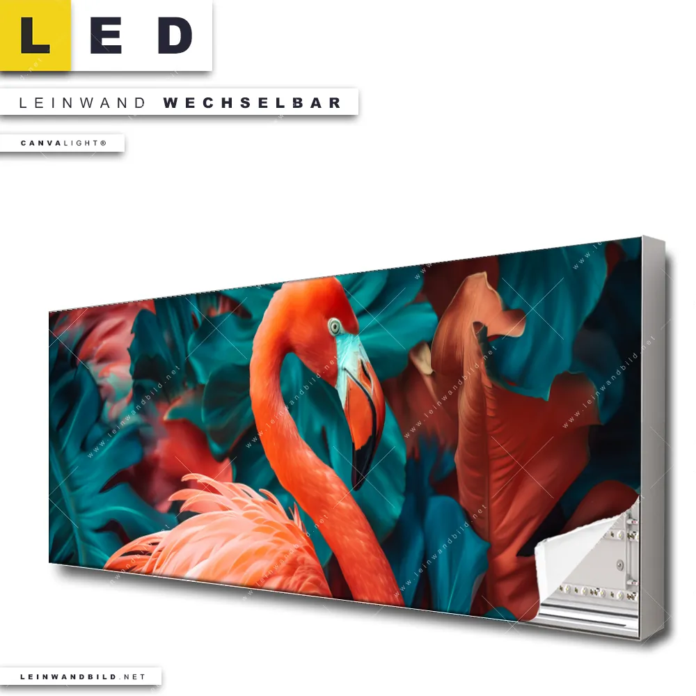 Du bist auf der Suche nach einem Tierwelt, Blumen - Botanik LED Leinwandbild im Panorama-Format? Begriffe wie Vogel, Flamingo, Dschungel, Wasser, Blätter, Pflanzen haben Dich auf der Suche nach Deinem neuen XXL LED Wandbild mit wechselbarer Leinwand inspiriert? Farben wie Orange, Rot, Weiss, Schwarz dürfen auf Deinem neuen extra breiten Leinwand-LED-Bild nicht fehlen und Leuchtbilder im Floral, Modern Art, Natürlich - Realistisch Stil passen perfekt zu Deinem Einrichtungsstil?