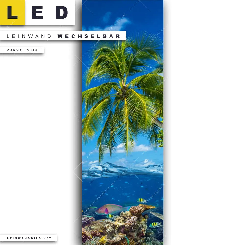 Du bist auf der Suche nach einem Landschaften, Strand - Meer LED Leinwandbild im Schmalen Format? Begriffe wie Ozean, Wasser, Horizont, Palmen, Sommer, Südsee - Karibik, Urlaub - Reisen, Meeresbewohner, Schildkröte, schnorcheln, Fische, Korallen, Korallenriff, Hai, Insel haben Dich auf der Suche nach Deinem neuen XXL LED Wandbild mit wechselbarer Leinwand inspiriert? Farben wie Blau, Türkis, Braun dürfen auf Deinem neuen Leinwand-LED-Bild im Panorama-Hochformat nicht fehlen und Leuchtbilder im Mixed Media Stil passen perfekt zu Deinem Einrichtungsstil?