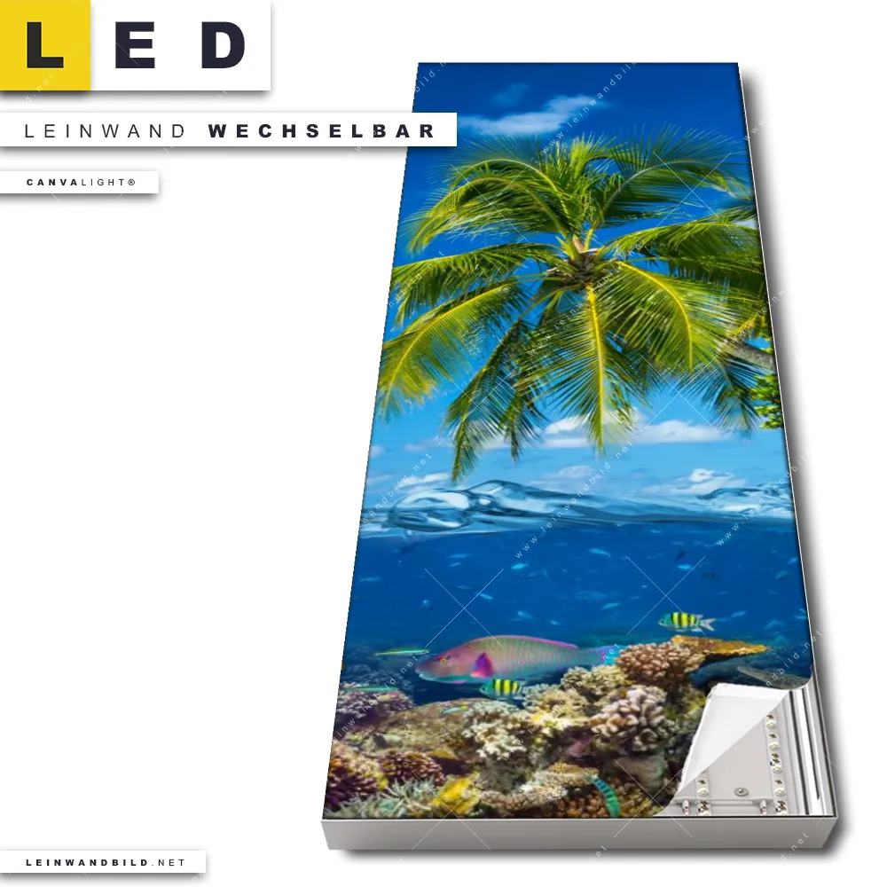 Dann sollte das LED Leinwandbild Canvalight® TEX | Tropisches Inselparadies | Schmal den Weg zu Dir finden. Das stufenlos dimmbare Leinwandbild Meerbewohner und paradiesischen Meer im steckerfertigen Leuchtrahmen mit Fernbedienung und optionaler Farbtemperatursteuerung fügt sich als Eye-Catcher harmonisch in jedes Arzt - Praxis, Bar - Gastronomie, Wohnzimmer - Schlafzimmer Raumkonzept ein.