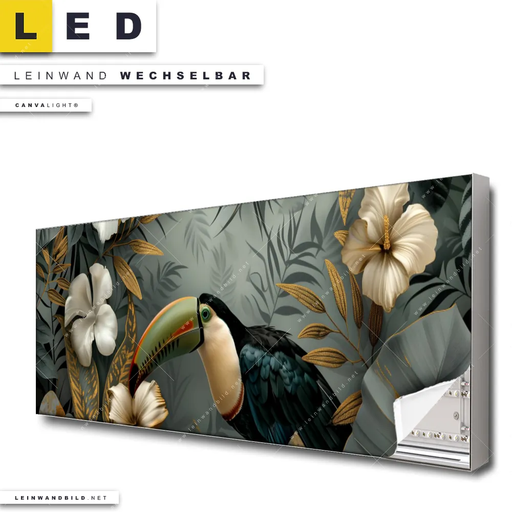 Du bist auf der Suche nach einem Blumen - Botanik, Tierwelt LED Leinwandbild im Panorama-Format? Begriffe wie Tierporträt, Tier, Vogel, Tukan, Blumen, Blüten, Dschungel, Blätter, Palmenblätter haben Dich auf der Suche nach Deinem neuen XXL LED Wandbild mit wechselbarer Leinwand inspiriert? Farben wie Gold, Weiss, Grau dürfen auf Deinem neuen extra breiten Leinwand-LED-Bild nicht fehlen und Leuchtbilder im Modern Art, Floral Stil passen perfekt zu Deinem Einrichtungsstil?