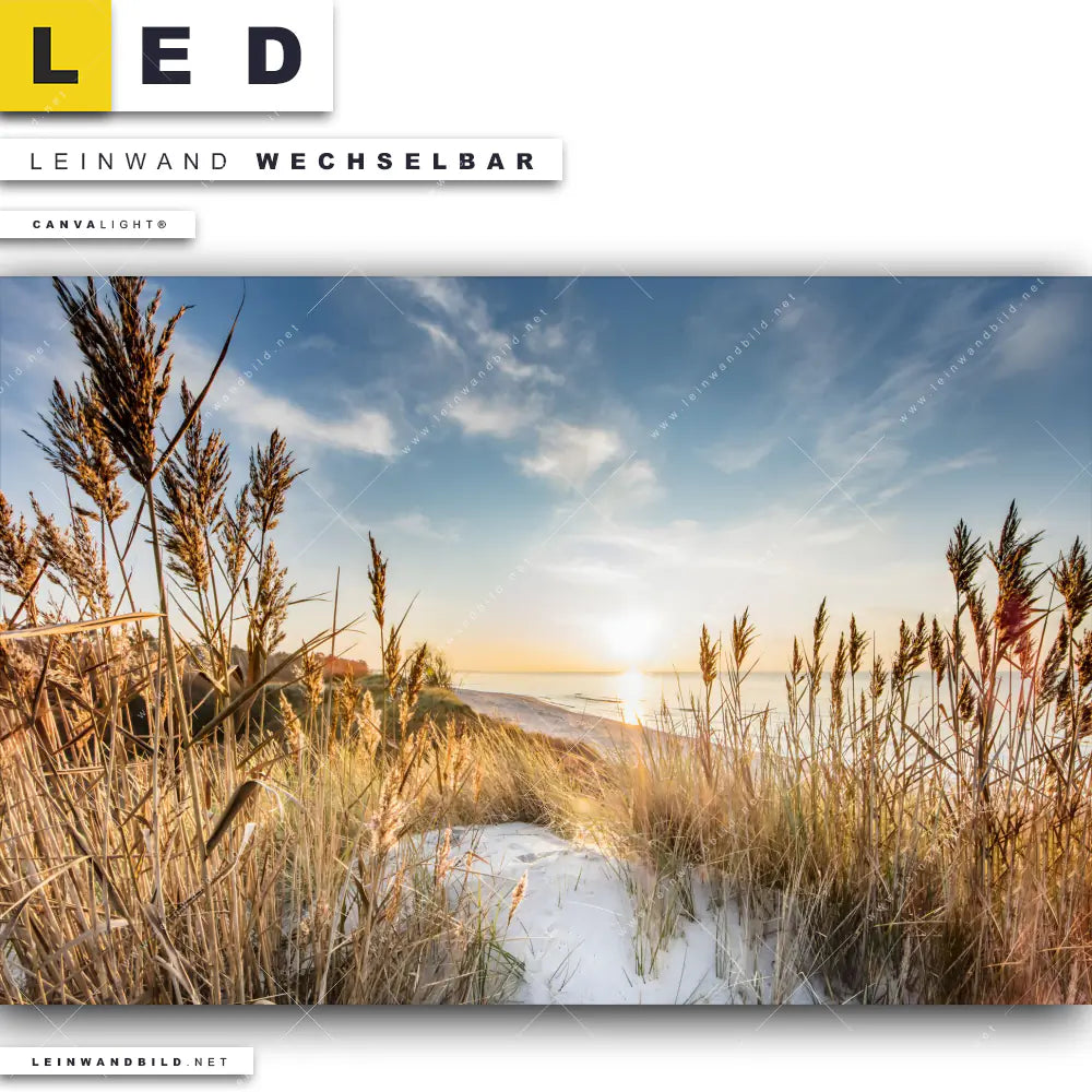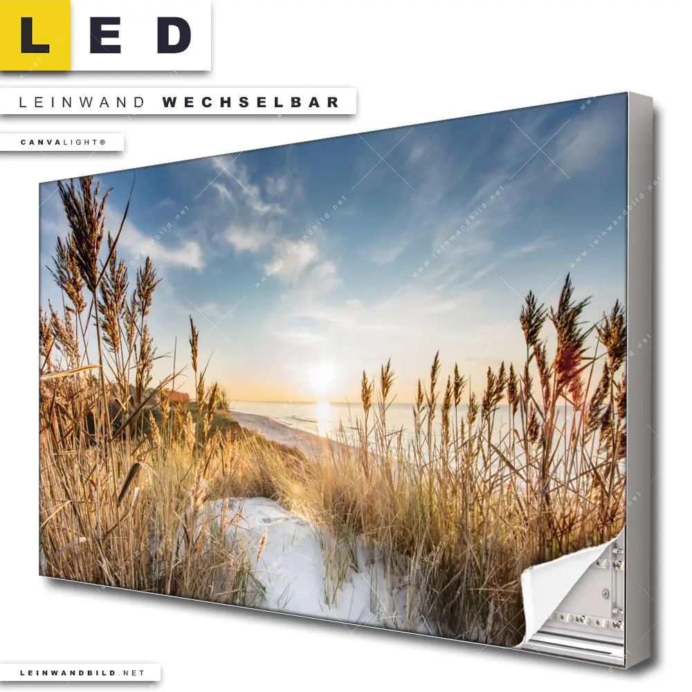 Du bist auf der Suche nach einem Landschaften, Strand - Meer LED Leinwandbild im Querformat? Begriffe wie Deutschland, Sommer, Dünen, Gräser, Urlaub, Reisen, Ostsee, Nordsee, Strand, Meer, Sonnenuntergang, Sonnenaufgang haben Dich auf der Suche nach Deinem neuen XXL LED Wandbild mit wechselbarer Leinwand inspiriert? Farben wie Beige, Blau, Braun dürfen auf Deinem neuen breiten Leinwand-LED-Bild nicht fehlen und Leuchtbilder im Retro - Vintage, Natürlich - Realistisch Stil passen perfekt zu Deinem Einrichtungsstil?