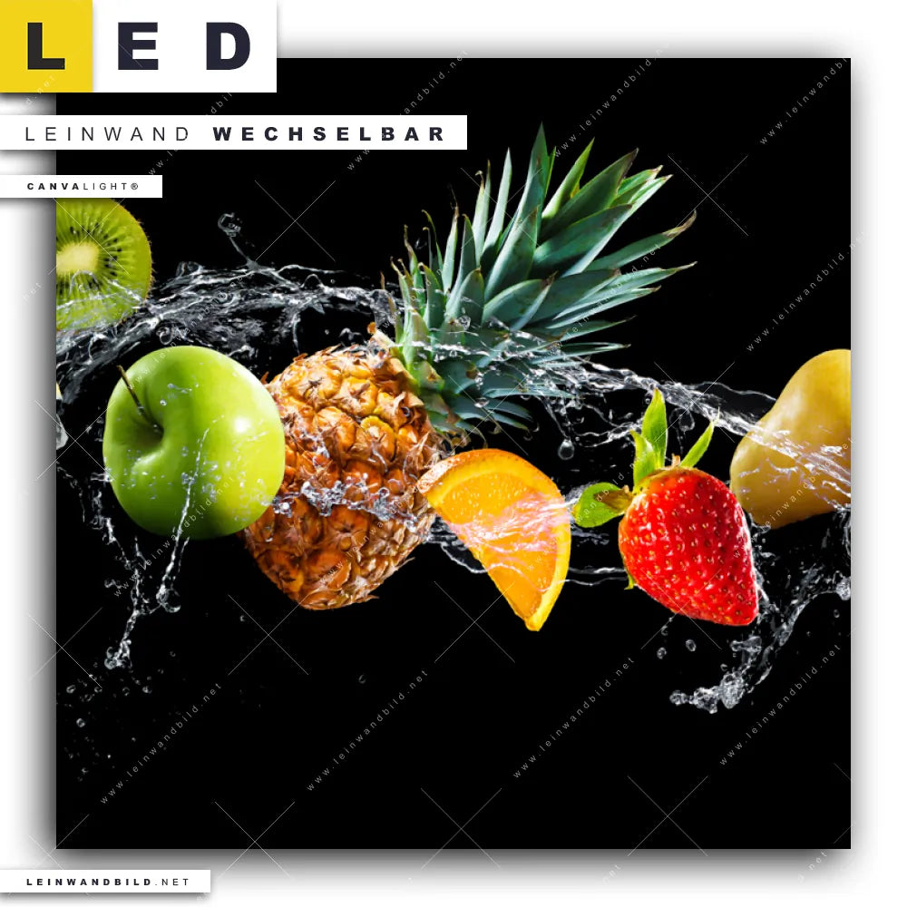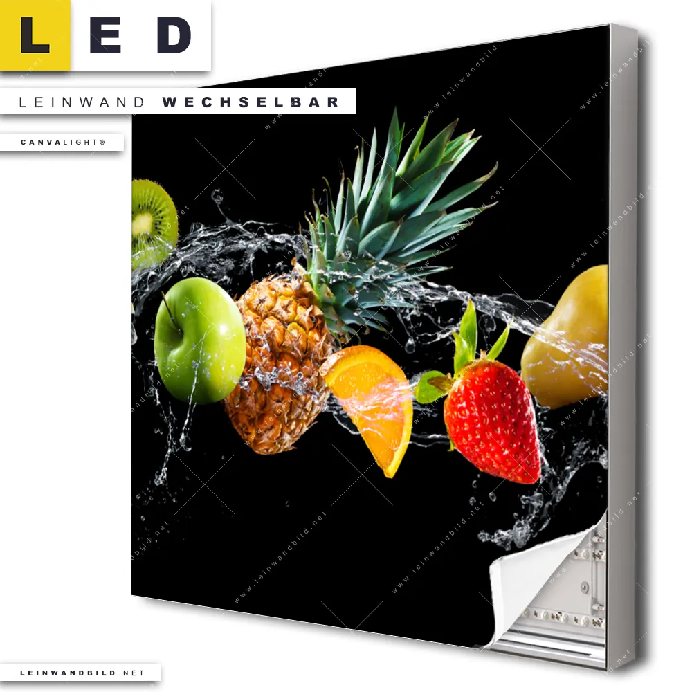 Du bist auf der Suche nach einem Essen - Trinken LED Leinwandbild im Quadratischen Format? Begriffe wie Obst, Zitrusfrüchte, Früchte, Kiwi, frisch, spritzig, Banane, Ananas, Spritzwasser, Wasser, Spritzer, Kokosnuss, Tropfen, Wassertropfen haben Dich auf der Suche nach Deinem neuen XXL LED Wandbild mit wechselbarer Leinwand inspiriert? Farben wie Bunt, Schwarz dürfen auf Deinem neuen Leinwand-LED-Bild nicht fehlen und Leuchtbilder im Mixed Media, Modern Art Stil passen perfekt zu Deinem Einrichtungsstil?