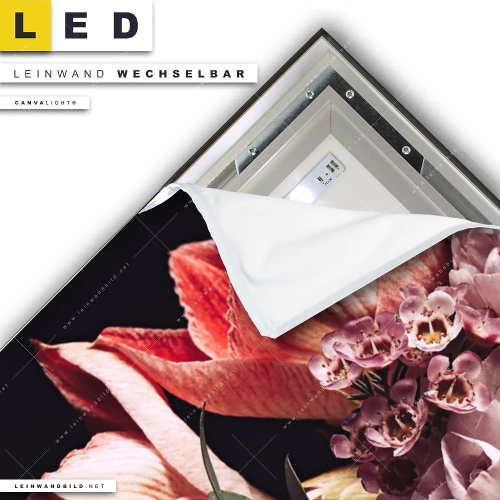 Du konfigurierst Dein individuelles LED Leinwandbild Canvalight® TEX | Vintage Blumenstrauß | Hochformat und wir produzieren es NEU für Dich. Unsere Blumen - Botanik LED Bilder mit wechselbarer Textil-Leinwand sind KEINE Lagerware. Du bist Dir unsicher, welches Motiv oder Format das richtige für dein individuelles Canvalight® Leuchtbild ist, dann helfen wir dir gerne weiter und beraten dich!