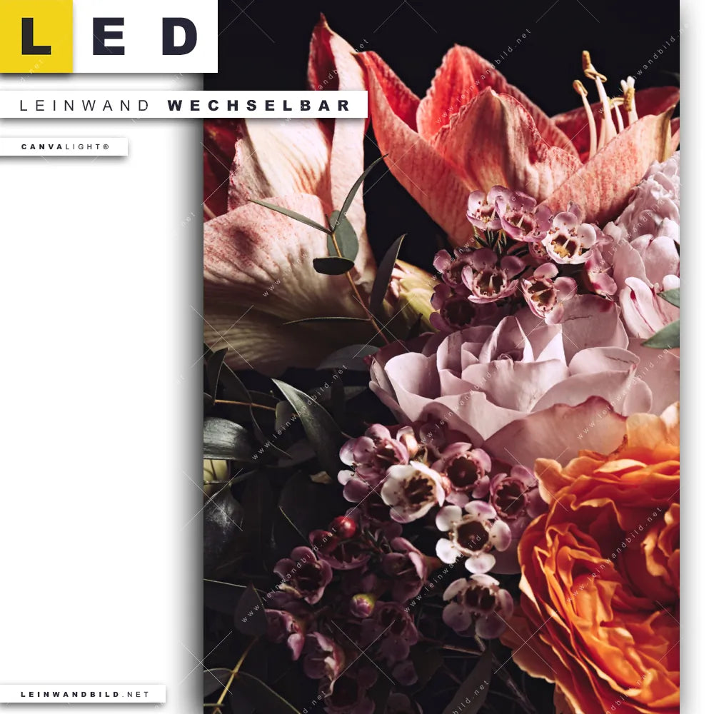 Du bist auf der Suche nach einem Blumen - Botanik LED Leinwandbild im Hochformat? Begriffe wie Blumen, vintage, Draufsicht, Blumenstrauß, Blüten haben Dich auf der Suche nach Deinem neuen XXL LED Wandbild mit wechselbarer Leinwand inspiriert? Farben wie Schwarz, Rosa, Orange, Grün, Pink, Lila dürfen auf Deinem neuen Leinwand-LED-Bild nicht fehlen und Leuchtbilder im Floral, Retro - Vintage Stil passen perfekt zu Deinem Einrichtungsstil?