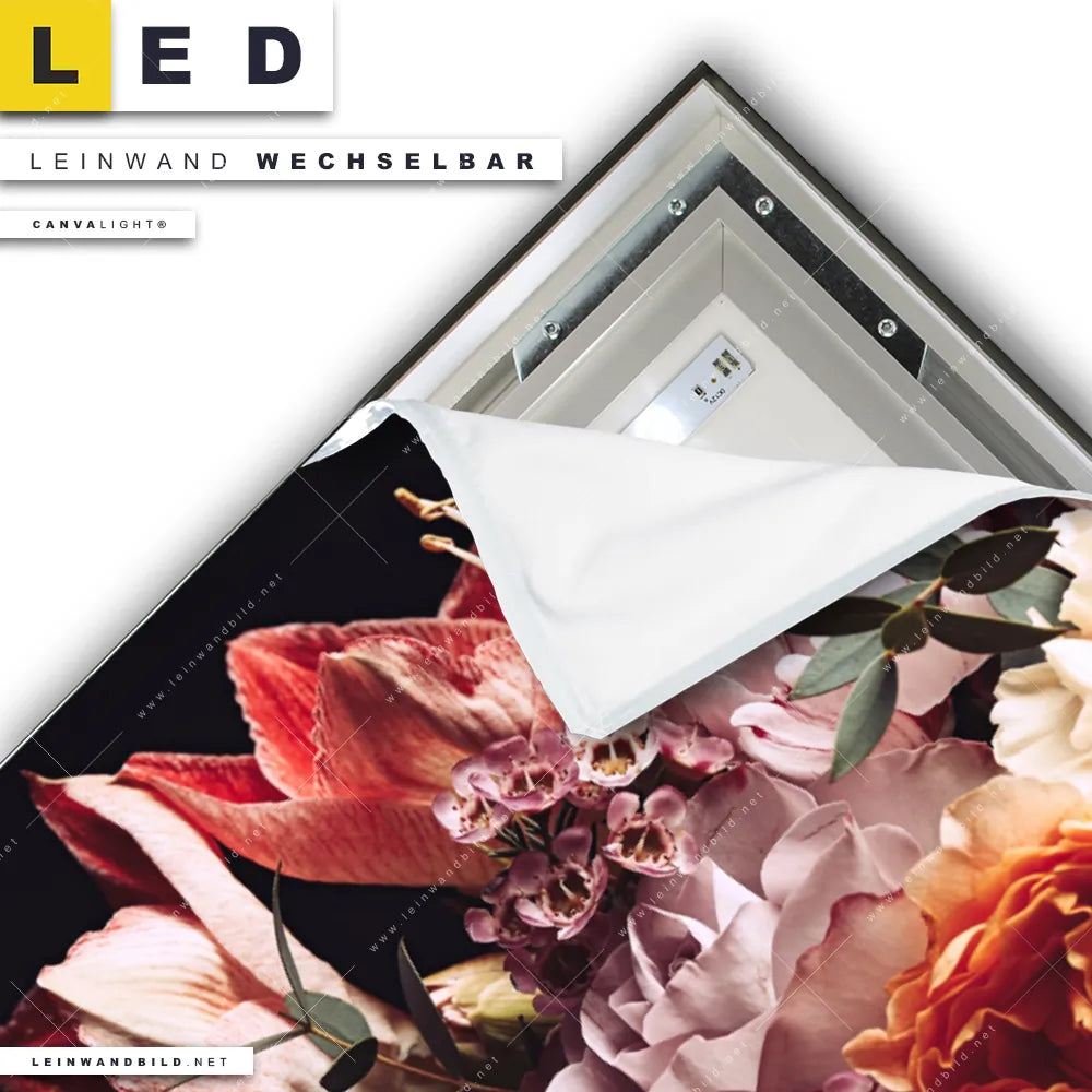 Du konfigurierst Dein individuelles LED Leinwandbild Canvalight® TEX | Vintage Blumenstrauß | Querformat und wir produzieren es NEU für Dich. Unsere Blumen - Botanik LED Bilder mit wechselbarer Textil-Leinwand sind KEINE Lagerware. Du bist Dir unsicher, welches Motiv oder Format das richtige für dein individuelles Canvalight® Leuchtbild ist, dann helfen wir dir gerne weiter und beraten dich!