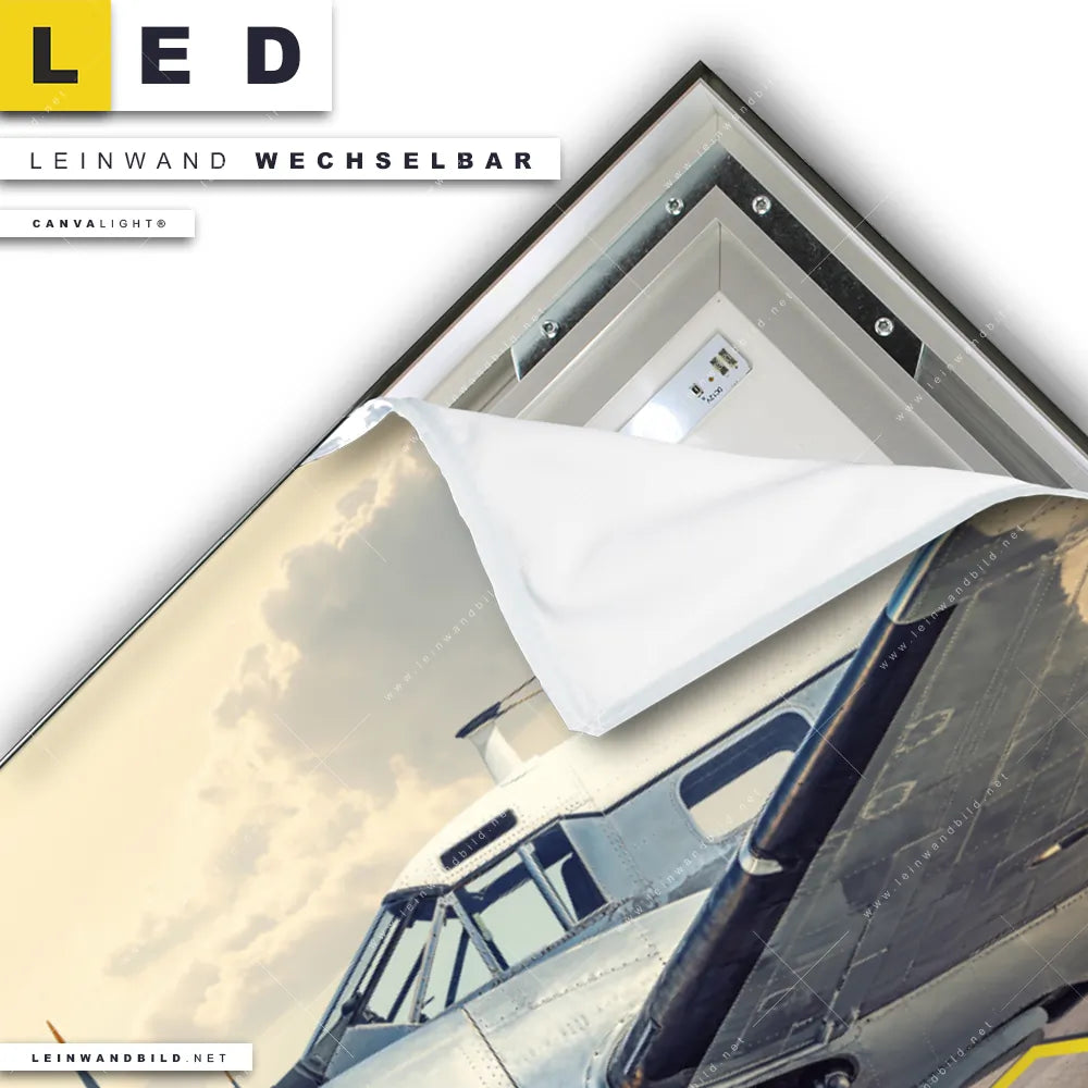 Du konfigurierst Dein individuelles LED Leinwandbild Canvalight® TEX | Vintage Flugzeug | Querformat und wir produzieren es NEU für Dich. Unsere Fahrzeuge LED Bilder mit wechselbarer Textil-Leinwand sind KEINE Lagerware. Du bist Dir unsicher, welches Motiv oder Format das richtige für dein individuelles Canvalight® Leuchtbild ist, dann helfen wir dir gerne weiter und beraten dich!