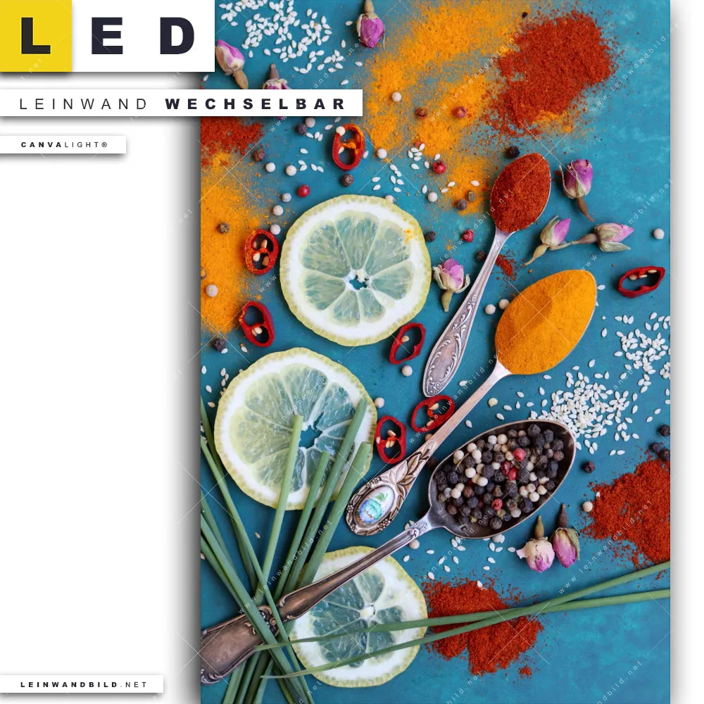 Du bist auf der Suche nach einem Essen - Trinken LED Leinwandbild im Hochformat? Begriffe wie Gewürze, Kräuter, Löffel, kochen, Silberlöffel, Lebensmittel, frisch, lecker, gesund, Zitrone, Curry haben Dich auf der Suche nach Deinem neuen XXL LED Wandbild mit wechselbarer Leinwand inspiriert? Farben wie Blau, Silber, Orange dürfen auf Deinem neuen Leinwand-LED-Bild nicht fehlen und Leuchtbilder im Modern Art, Natürlich - Realistisch Stil passen perfekt zu Deinem Einrichtungsstil?