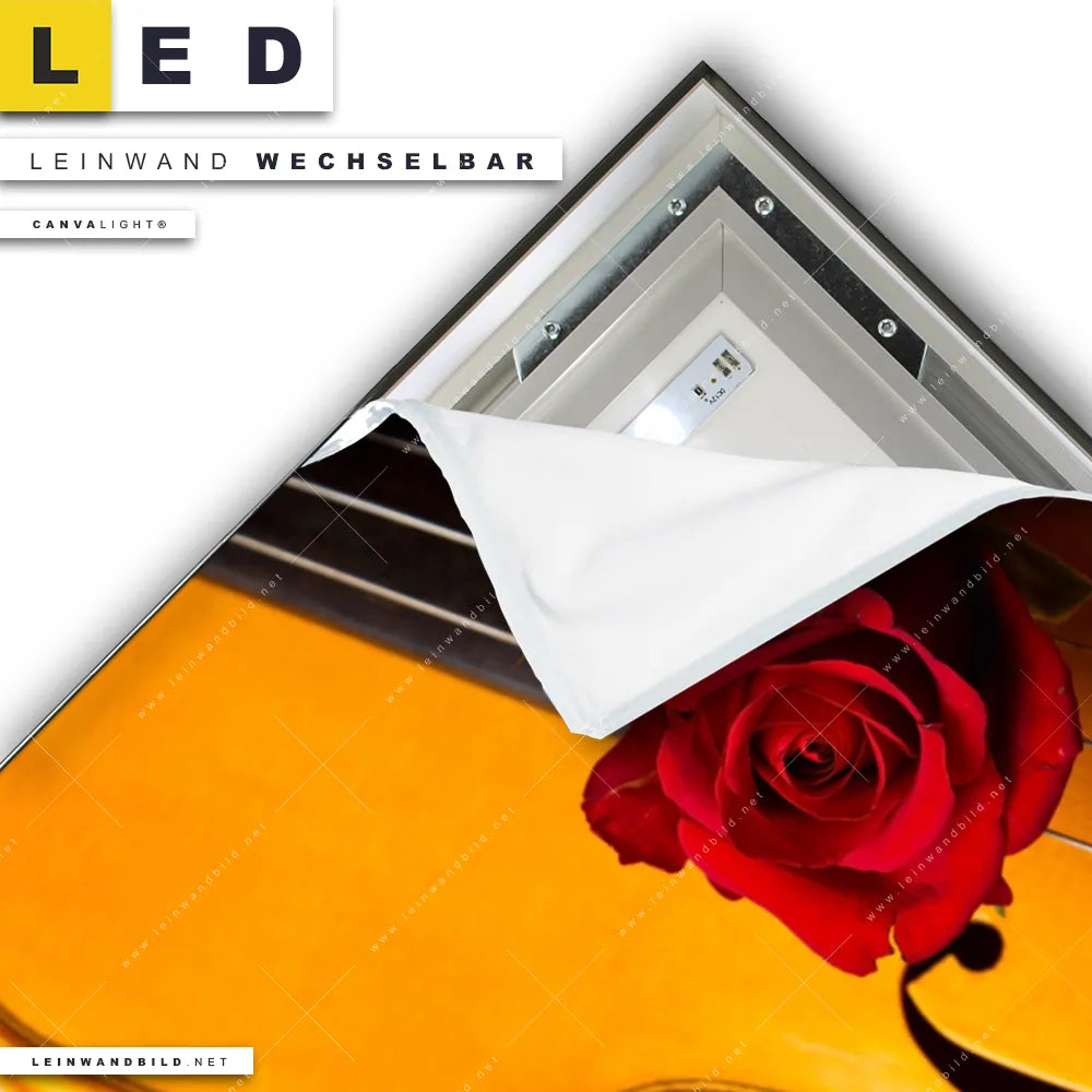 Dann sollte das LED Leinwandbild Canvalight® TEX | Violine & Rose | Querformat den Weg zu Dir finden. Das stufenlos dimmbare Leinwandbild Rosenblüte auf Geige im steckerfertigen Leuchtrahmen mit Fernbedienung und optionaler Farbtemperatursteuerung fügt sich als Eye-Catcher harmonisch in jedes Bar - Gastronomie, Wohnzimmer - Schlafzimmer Raumkonzept ein.