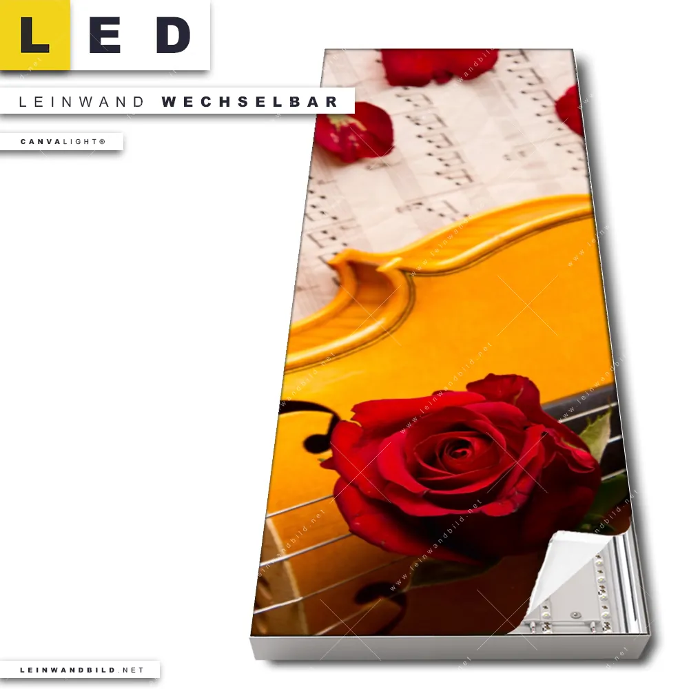 Du bist auf der Suche nach einem Blumen - Botanik LED Leinwandbild im Schmalen Format? Begriffe wie Musik, Instrument, musikalisch, Blüte, Blume, Rose, Geige, Violine haben Dich auf der Suche nach Deinem neuen XXL LED Wandbild mit wechselbarer Leinwand inspiriert? Farben wie Rot, Beige, Braun dürfen auf Deinem neuen Leinwand-LED-Bild im Panorama-Hochformat nicht fehlen und Leuchtbilder im Floral, Natürlich - Realistisch Stil passen perfekt zu Deinem Einrichtungsstil?