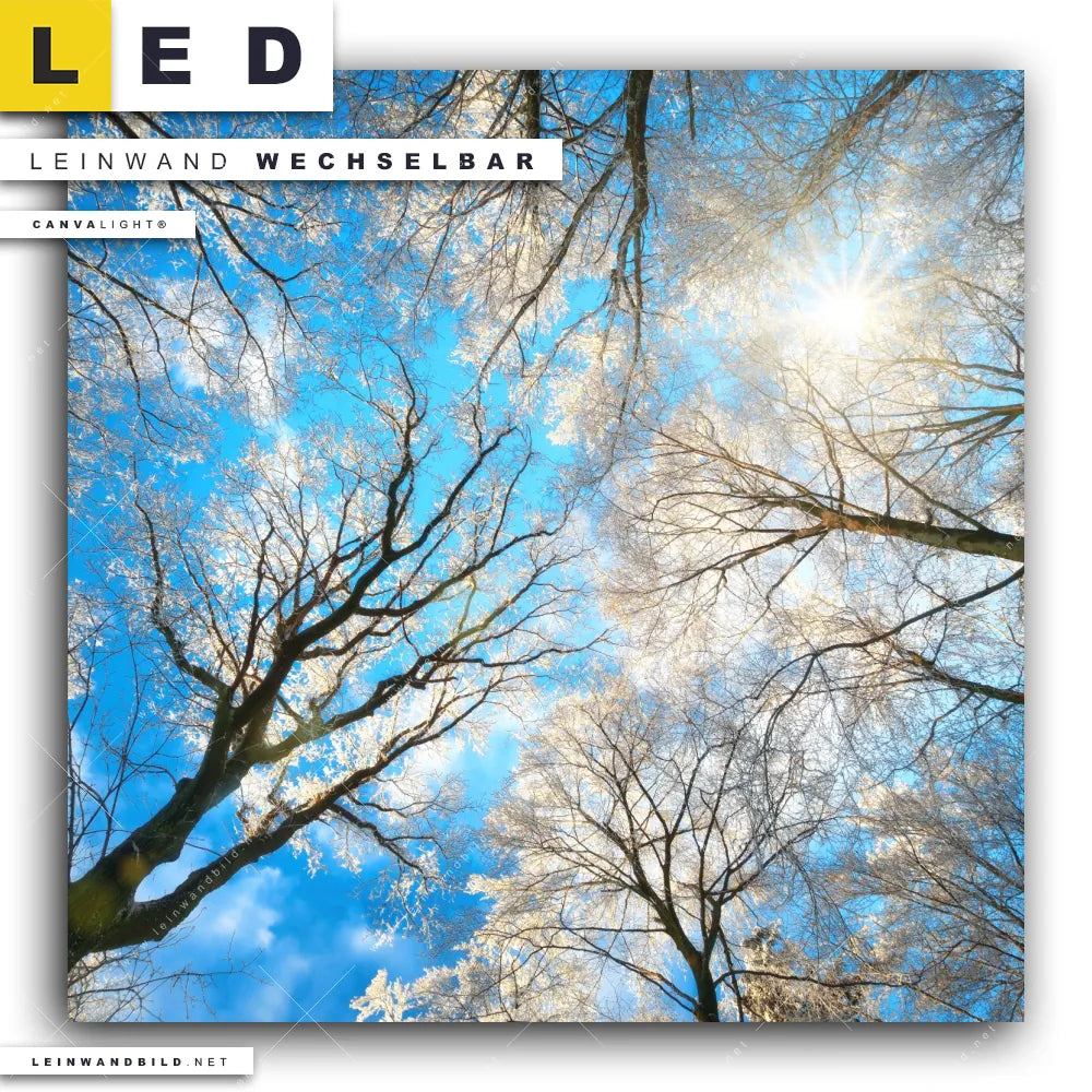 Du bist auf der Suche nach einem Wald - Bäume LED Leinwandbild im Quadratischen Format? Begriffe wie Wald, Baum, Bäume, Natur, Baumkrone, Froschperspektive, Baumwipfel, Schnee, Winter, Buche, Eiche haben Dich auf der Suche nach Deinem neuen XXL LED Wandbild mit wechselbarer Leinwand inspiriert? Farben wie Hellblau, Blau, Weiss dürfen auf Deinem neuen Leinwand-LED-Bild nicht fehlen und Leuchtbilder im Natürlich - Realistisch, Modern Art Stil passen perfekt zu Deinem Einrichtungsstil?