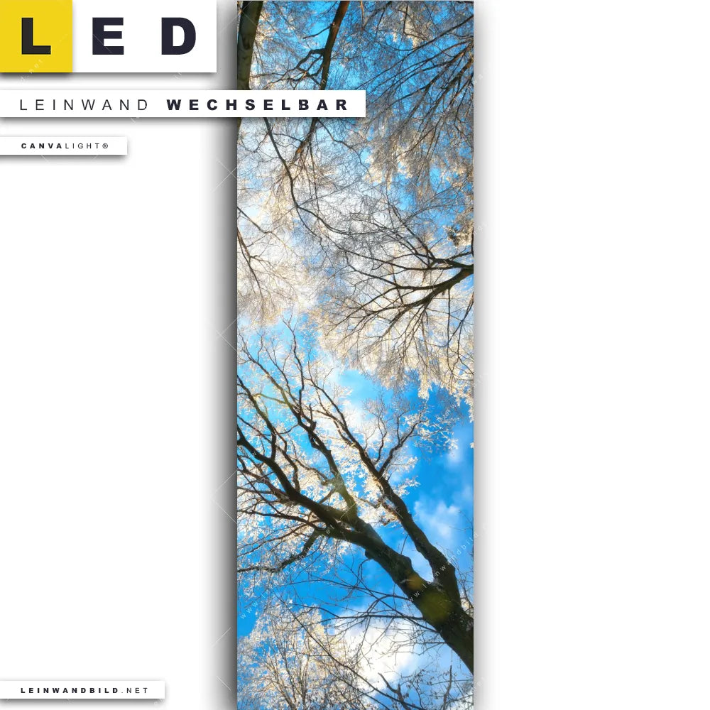 Du bist auf der Suche nach einem Wald - Bäume LED Leinwandbild im Schmalen Format? Begriffe wie Wald, Baum, Bäume, Natur, Baumkrone, Froschperspektive, Baumwipfel, Schnee, Winter, Buche, Eiche haben Dich auf der Suche nach Deinem neuen XXL LED Wandbild mit wechselbarer Leinwand inspiriert? Farben wie Hellblau, Blau, Weiss dürfen auf Deinem neuen Leinwand-LED-Bild im Panorama-Hochformat nicht fehlen und Leuchtbilder im Natürlich - Realistisch, Modern Art Stil passen perfekt zu Deinem Einrichtungsstil?