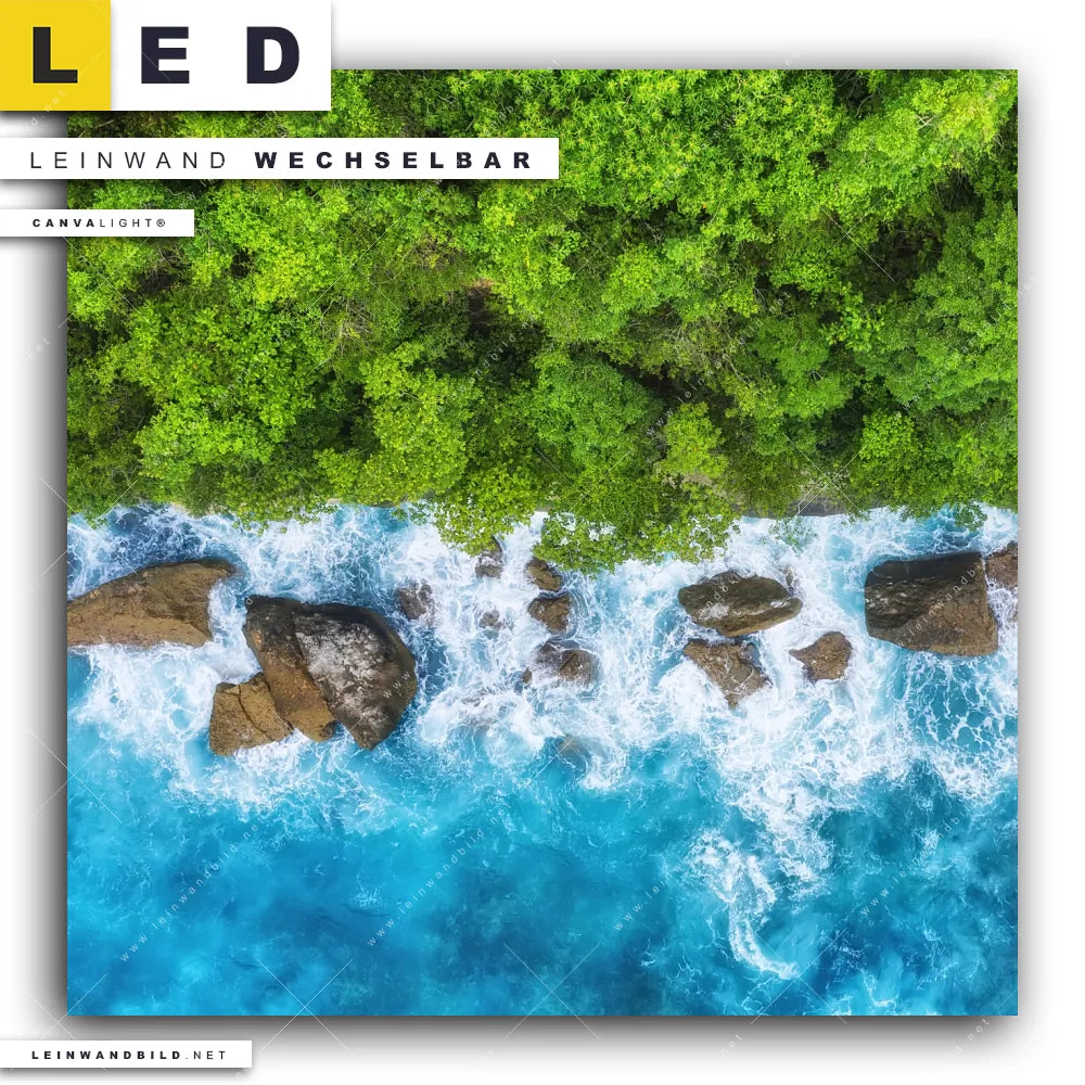 Begriffe wie Wald, Landschaft, Baum, Bäume, Natur, Nadelwald, Laubwald, Meer, Wellen, Felsen, Vogelperspektive, Insel haben Dich auf der Suche nach Deinem neuen LED Wandbild mit beleuchteter Leinwand inspiriert? Dann sollte das LED Bild Waldlandschaft an der Küste mit austauschbarer Textil-Fotoleinwand den Weg zu Dir finden.