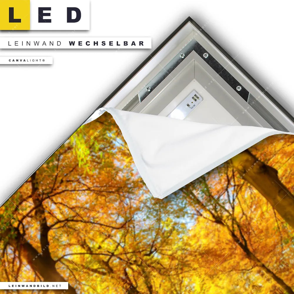 Du konfigurierst Dein individuelles LED Leinwandbild Canvalight® TEX | Waldlandschaft im Herbst | Panorama und wir produzieren es NEU für Dich. Unsere Landschaften, Wald - Bäume LED Bilder mit wechselbarer Textil-Leinwand sind KEINE Lagerware. Du bist Dir unsicher, welches Motiv oder Format das richtige für dein individuelles Canvalight® Leuchtbild ist, dann helfen wir dir gerne weiter und beraten dich!