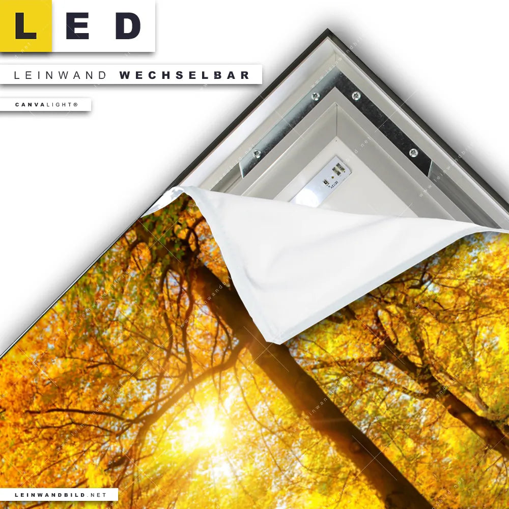 Du konfigurierst Dein individuelles LED Leinwandbild Canvalight® TEX | Waldlandschaft im Herbst | Querformat und wir produzieren es NEU für Dich. Unsere Landschaften, Wald - Bäume LED Bilder mit wechselbarer Textil-Leinwand sind KEINE Lagerware. Du bist Dir unsicher, welches Motiv oder Format das richtige für dein individuelles Canvalight® Leuchtbild ist, dann helfen wir dir gerne weiter und beraten dich!
