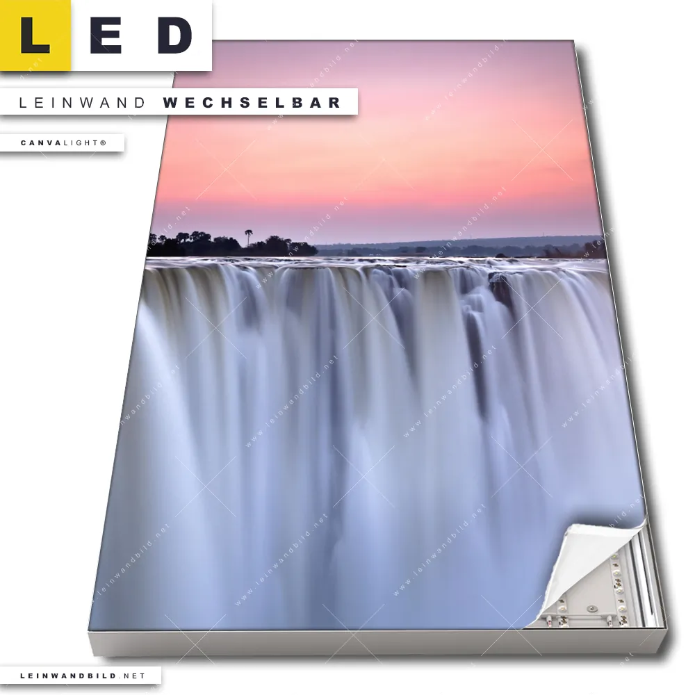 Begriffe wie Sehenswürdigkeit, Afrika, Wasserfall, Landschaft, Natur haben Dich auf der Suche nach Deinem neuen LED Wandbild mit beleuchteter Leinwand inspiriert? Dann sollte das LED Bild Wasserfall bei Sonnenuntergang mit austauschbarer Textil-Fotoleinwand den Weg zu Dir finden.